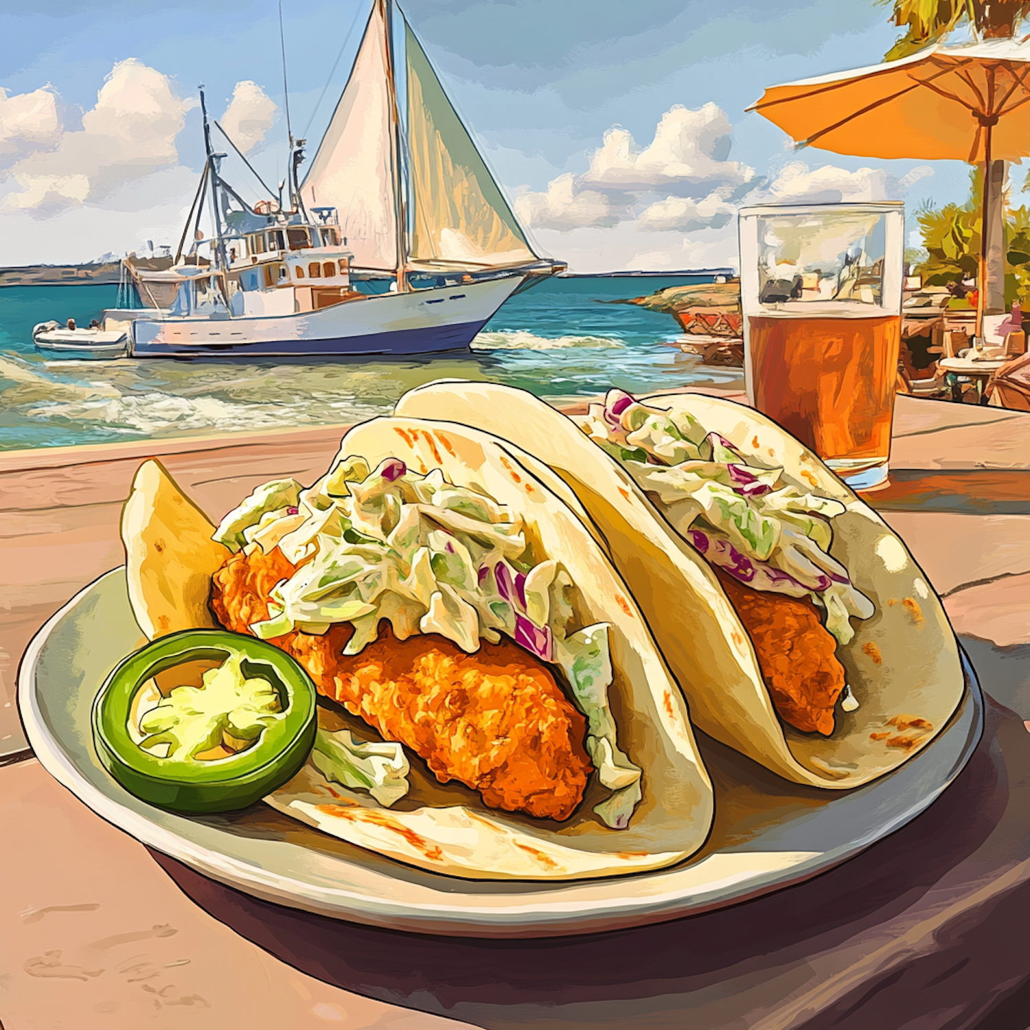 Illustration of fish tacos with slaw and jalapeño by the sea, featuring a sailboat and a glass of beer in a sunny coastal setting.