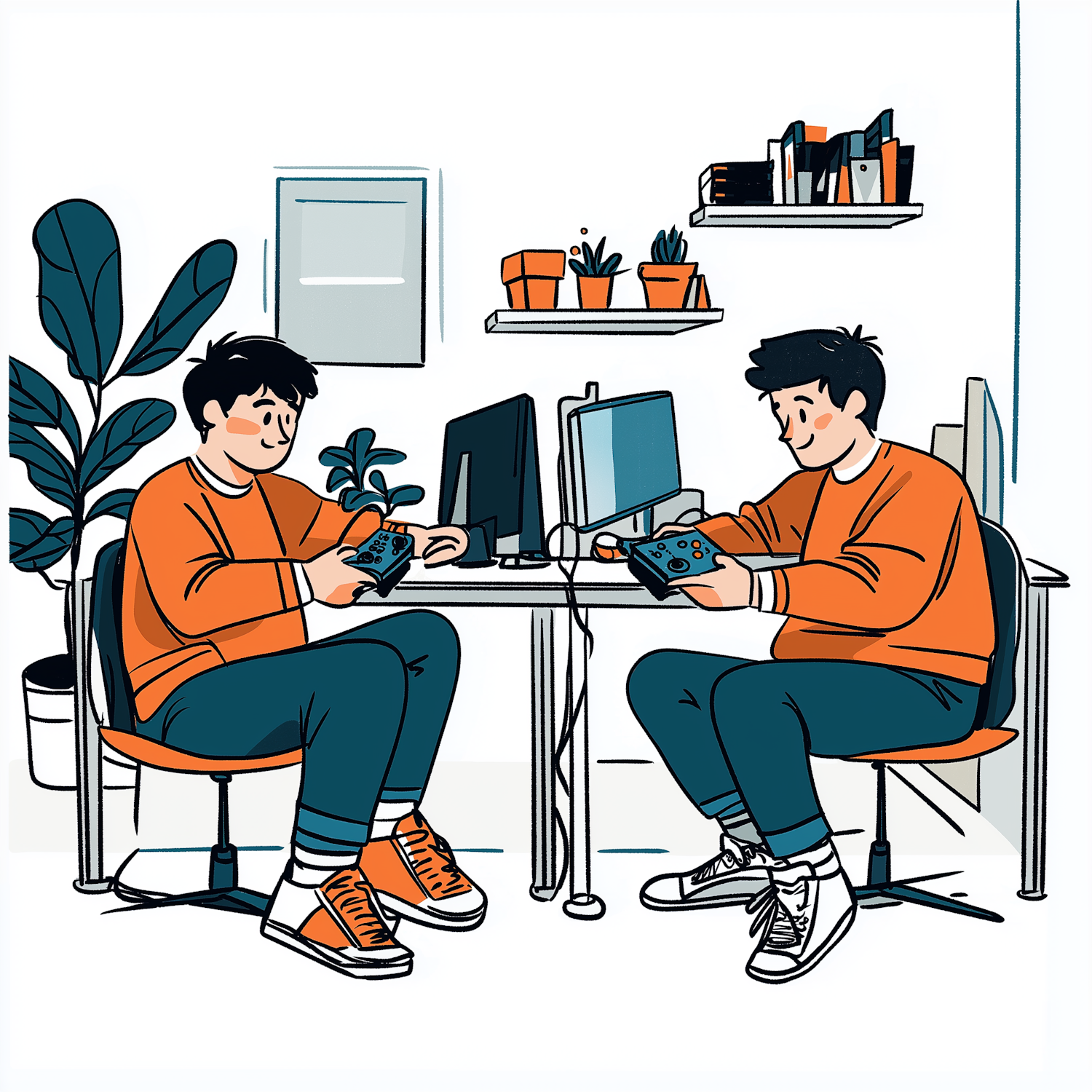Two young men gaming together in a cozy room with plants and books, wearing matching orange sweaters and holding controllers.