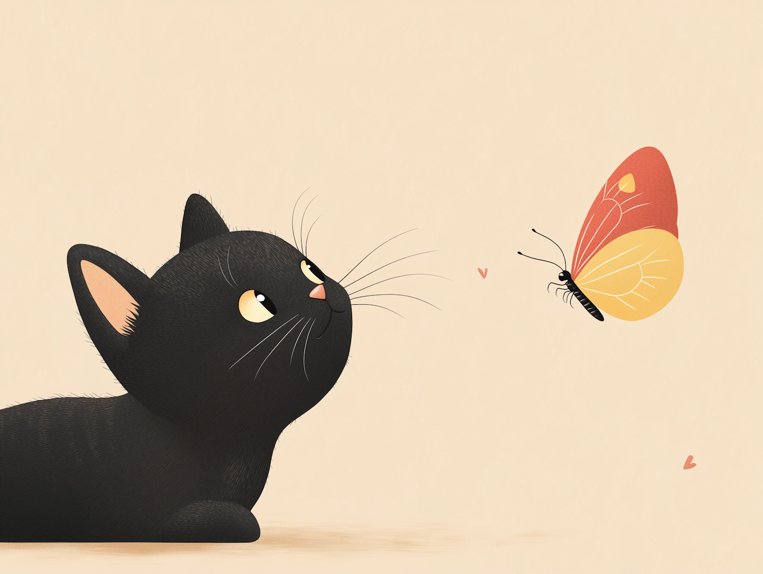 Adorable illustration of a curious black cat watching a vibrant orange and yellow butterfly on a soft beige background.