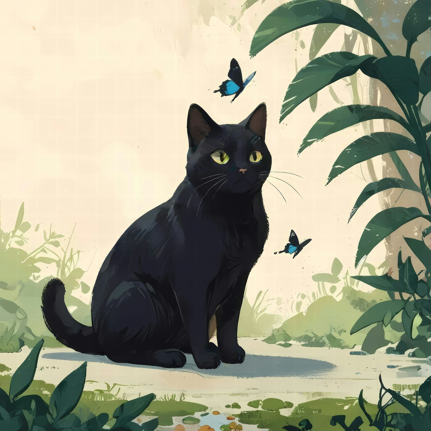 A black cat with yellow eyes sits among green plants, watching blue butterflies. A serene and colorful nature scene.