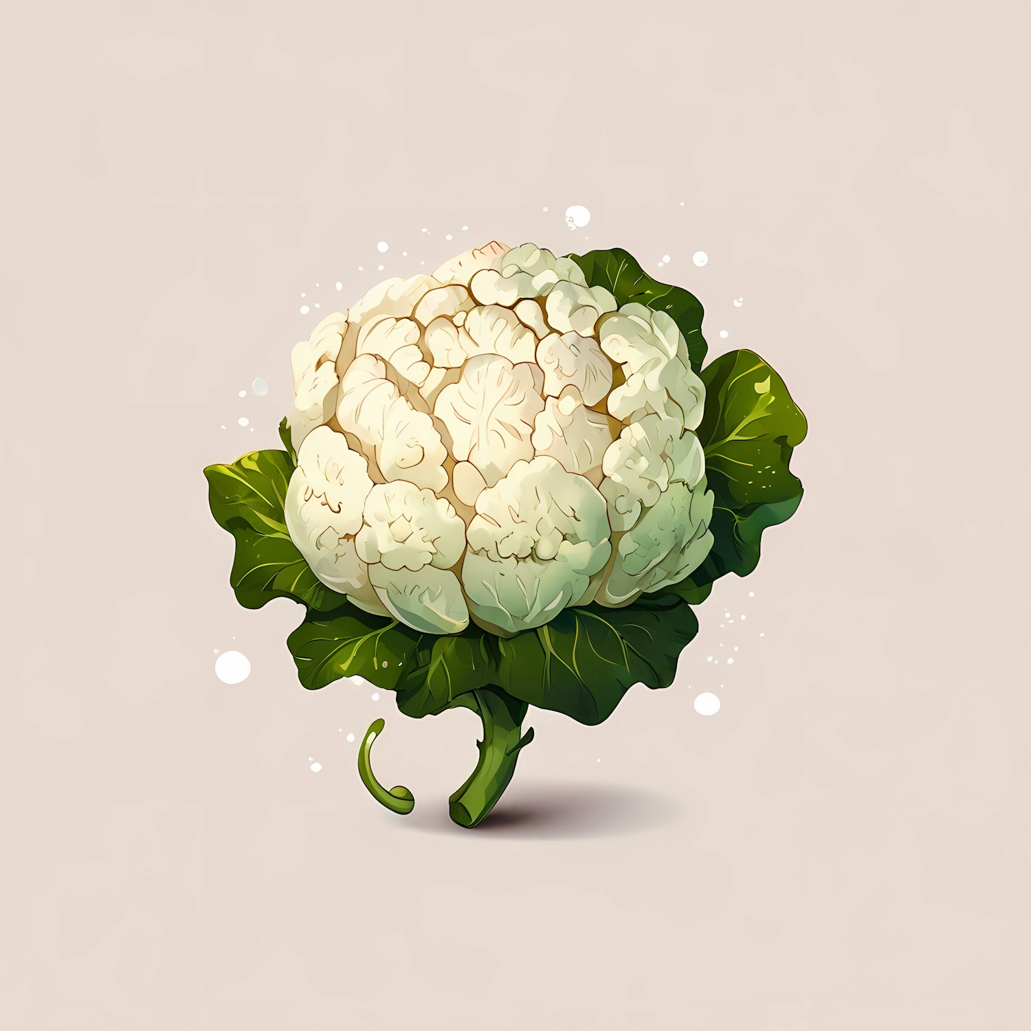Illustrated cauliflower with creamy florets and vibrant green leaves on a soft beige background, showcasing fresh organic beauty.