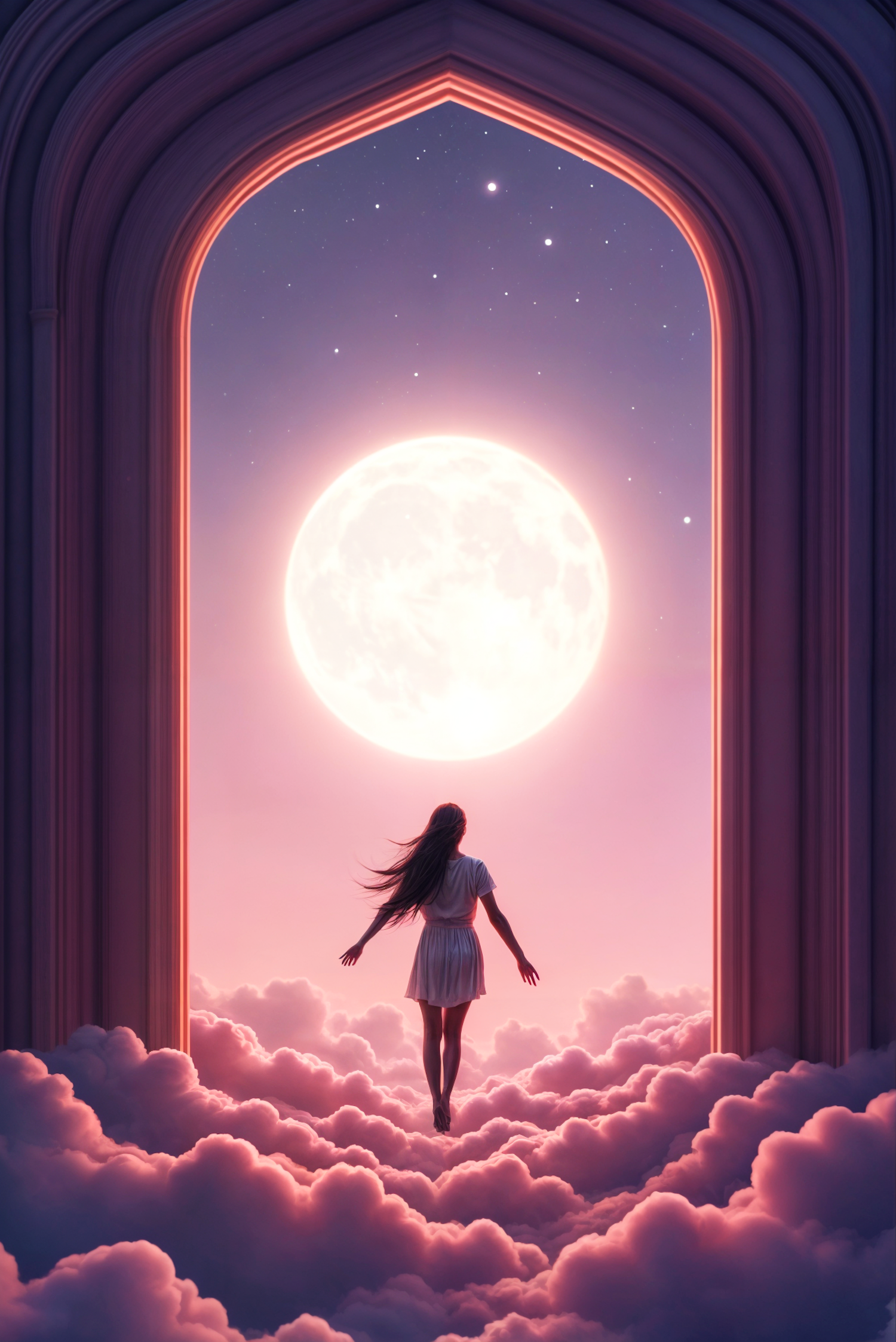 A woman in a white dress stands on pink clouds, gazing at a glowing full moon through an ornate archway. Dreamlike and ethereal scene.