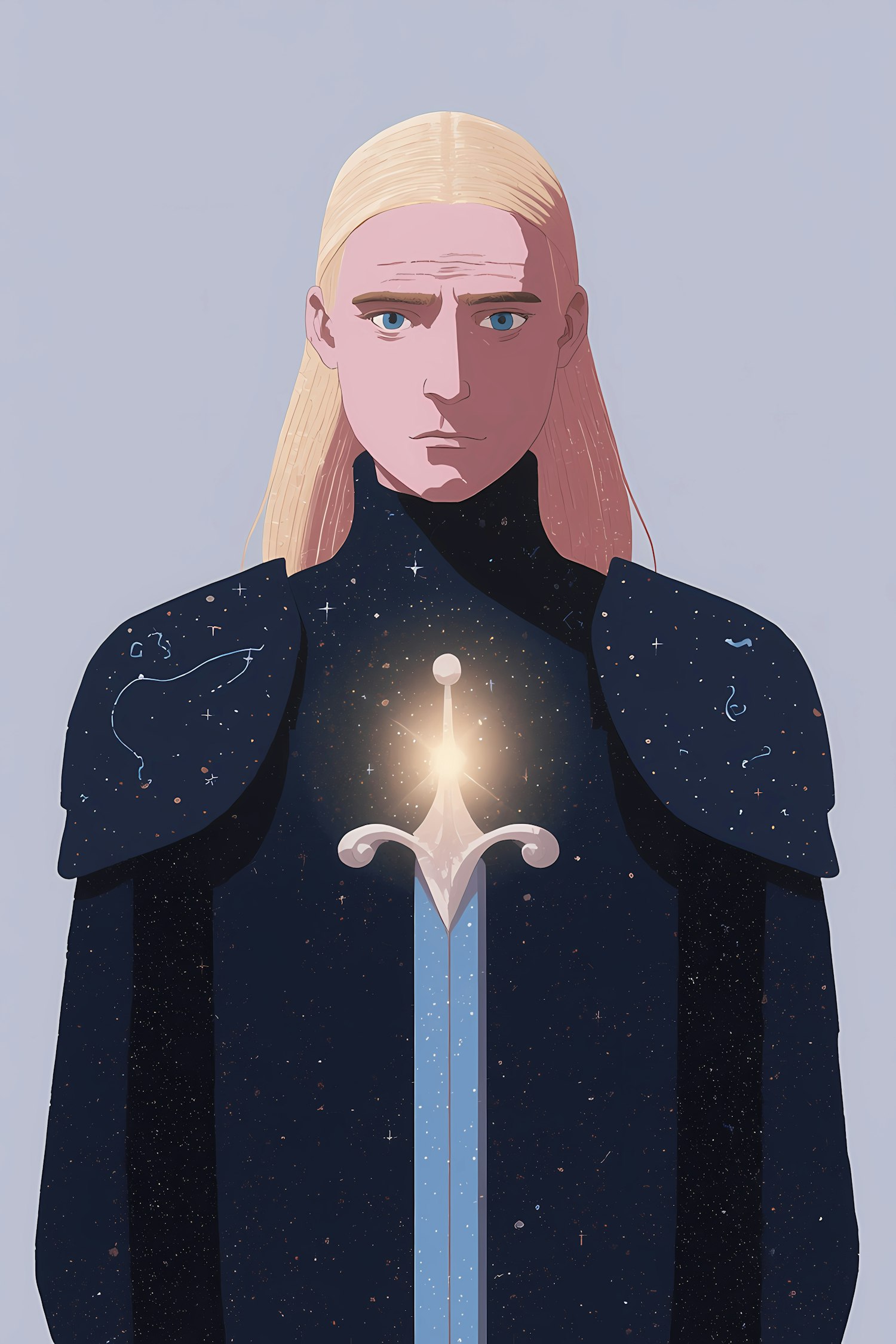 Stylized illustration of a blonde character in starry armor holding a glowing sword, set against a plain background.