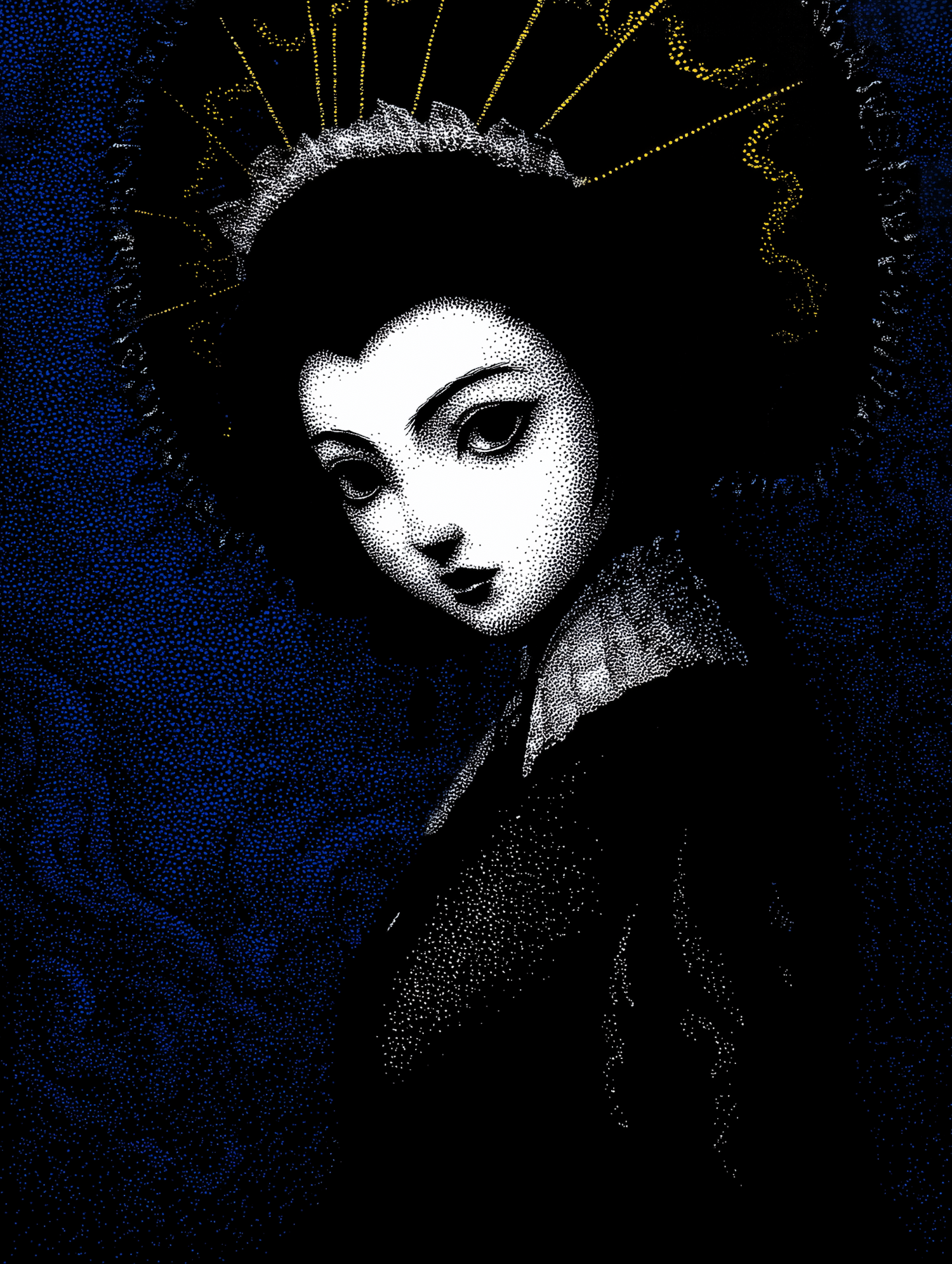 Stylized illustration of a woman with a halo-like design, pale skin, and dark hair, set against a textured blue background with golden accents.