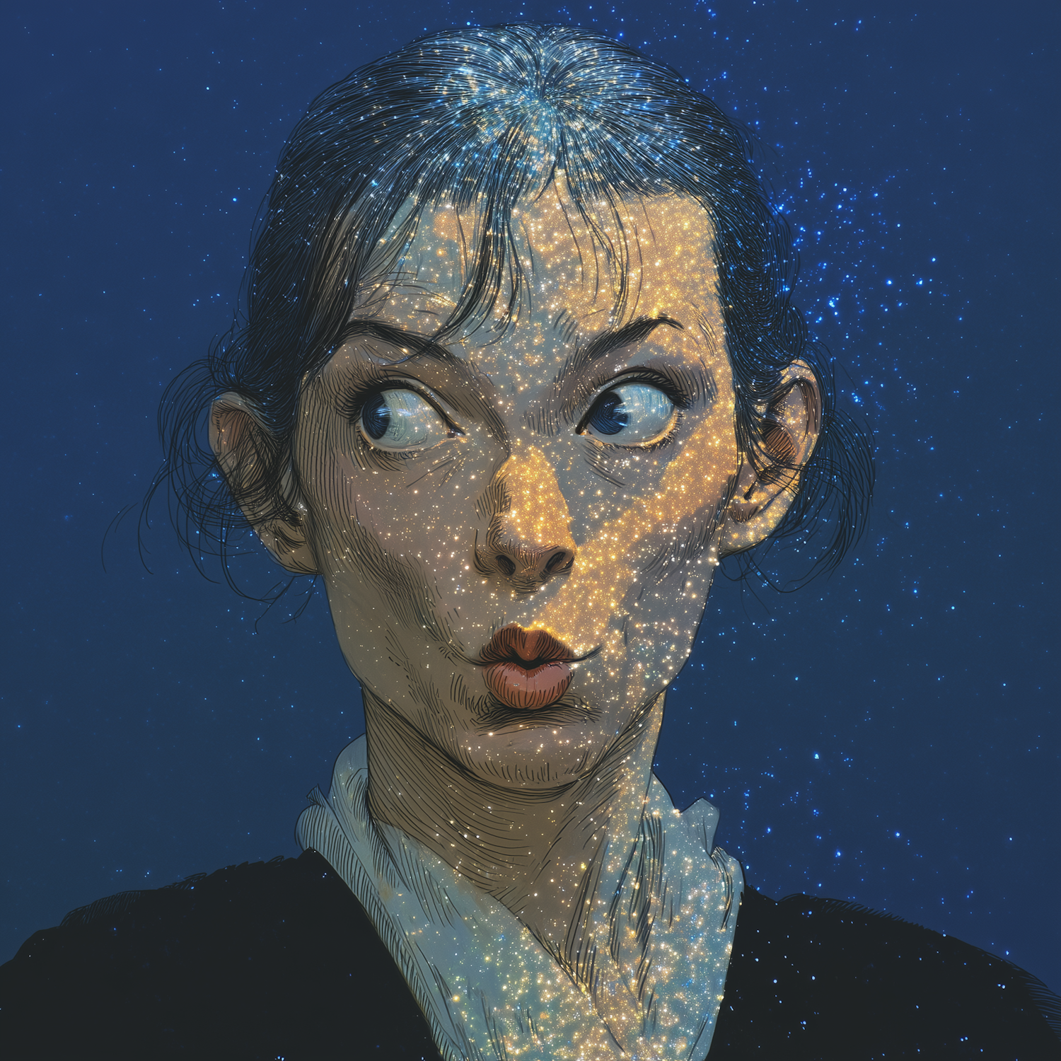 A whimsical illustration of a woman with a starry night sky pattern on her face, set against a deep blue background.