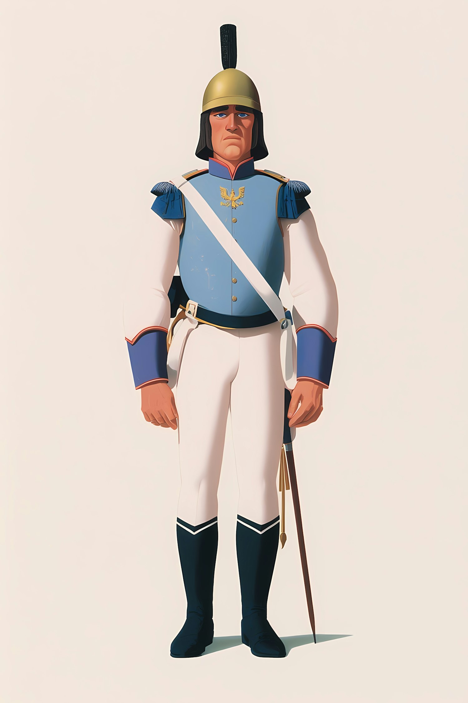 Stylized illustration of a soldier in ceremonial uniform, featuring a blue tunic, white trousers, and a golden helmet with a black plume.