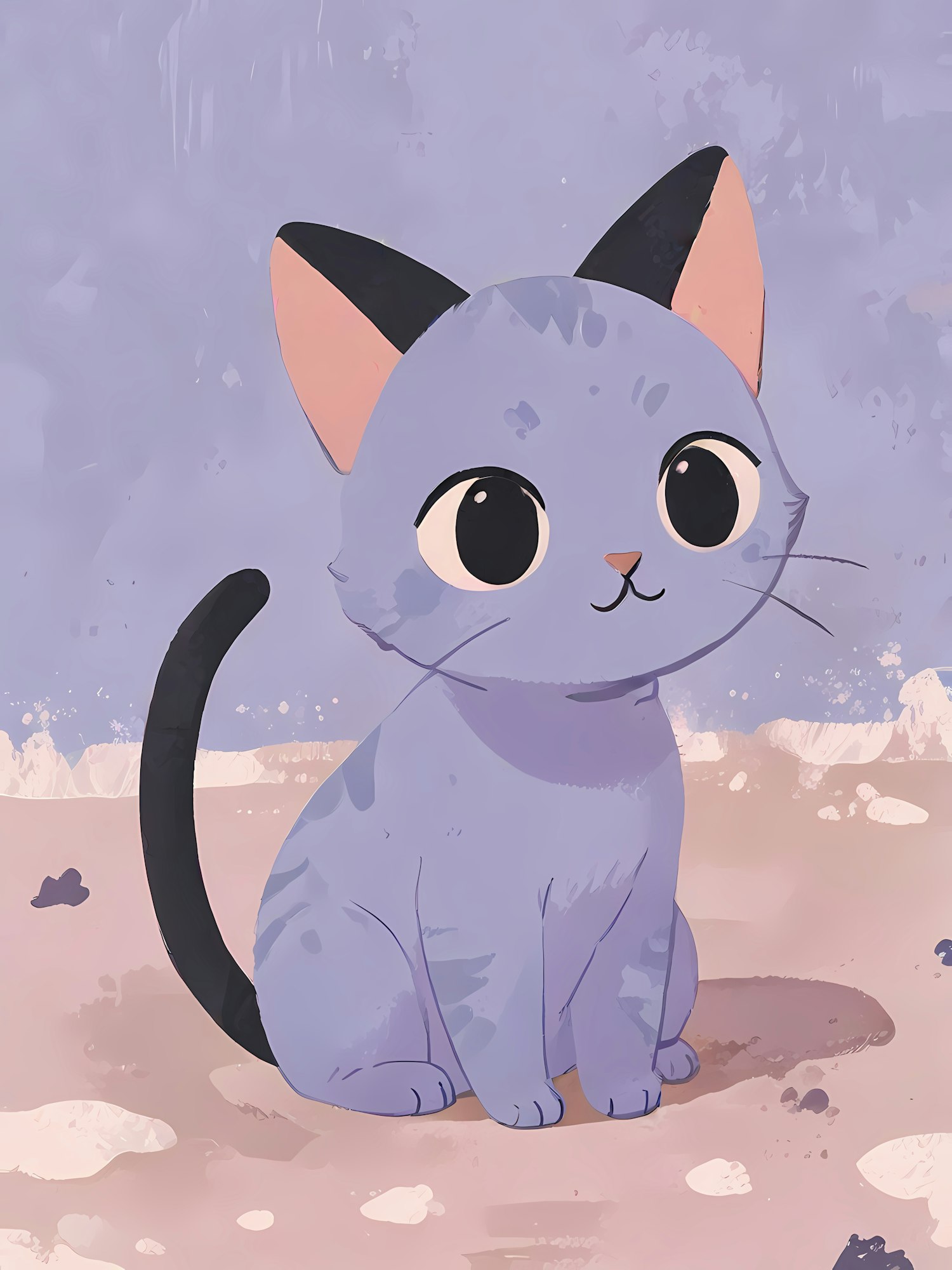 Adorable cartoon cat with purple fur and big eyes, sitting on a pastel background. Perfect for cute and whimsical art lovers.