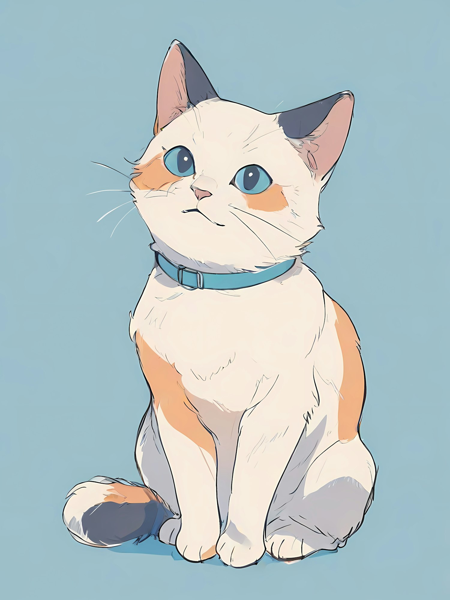 Adorable illustration of a white cat with orange and black patches, big blue eyes, and a light blue collar on a soft blue background.