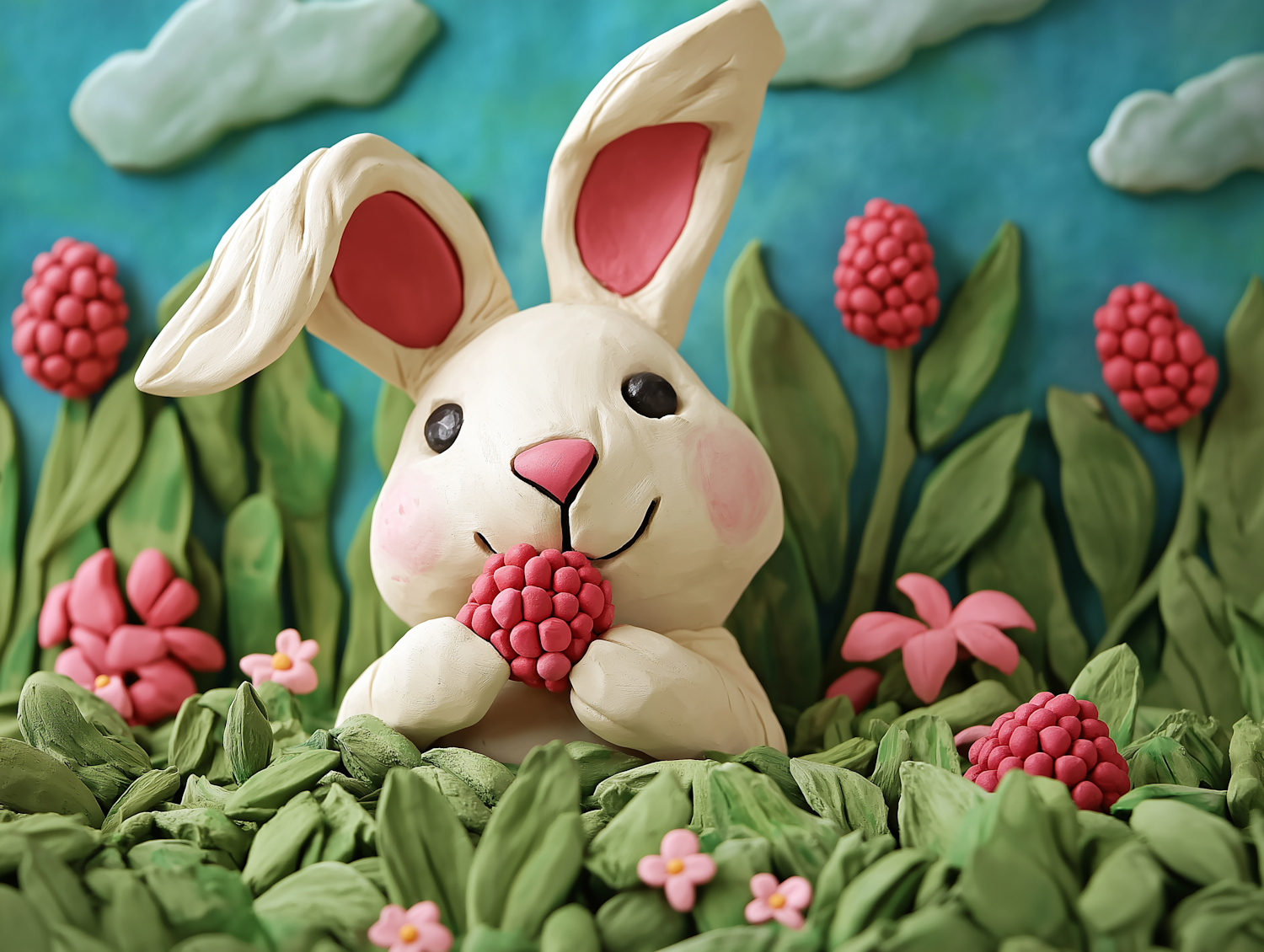 Adorable claymation rabbit holding a raspberry, surrounded by green leaves and pink flowers under a blue sky with clouds.
