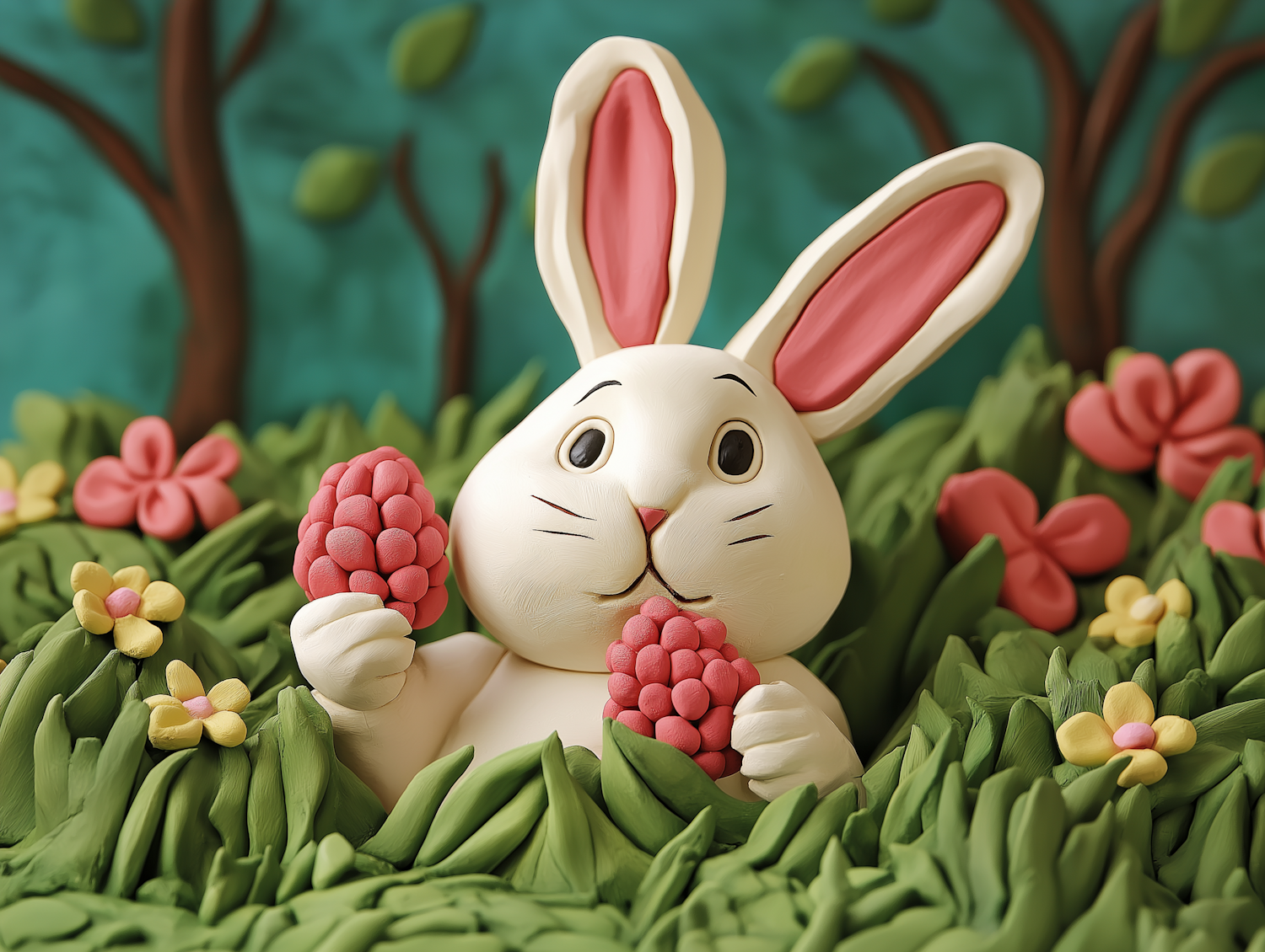 Adorable claymation rabbit with pink ears holding berries in a vibrant garden with flowers and trees.