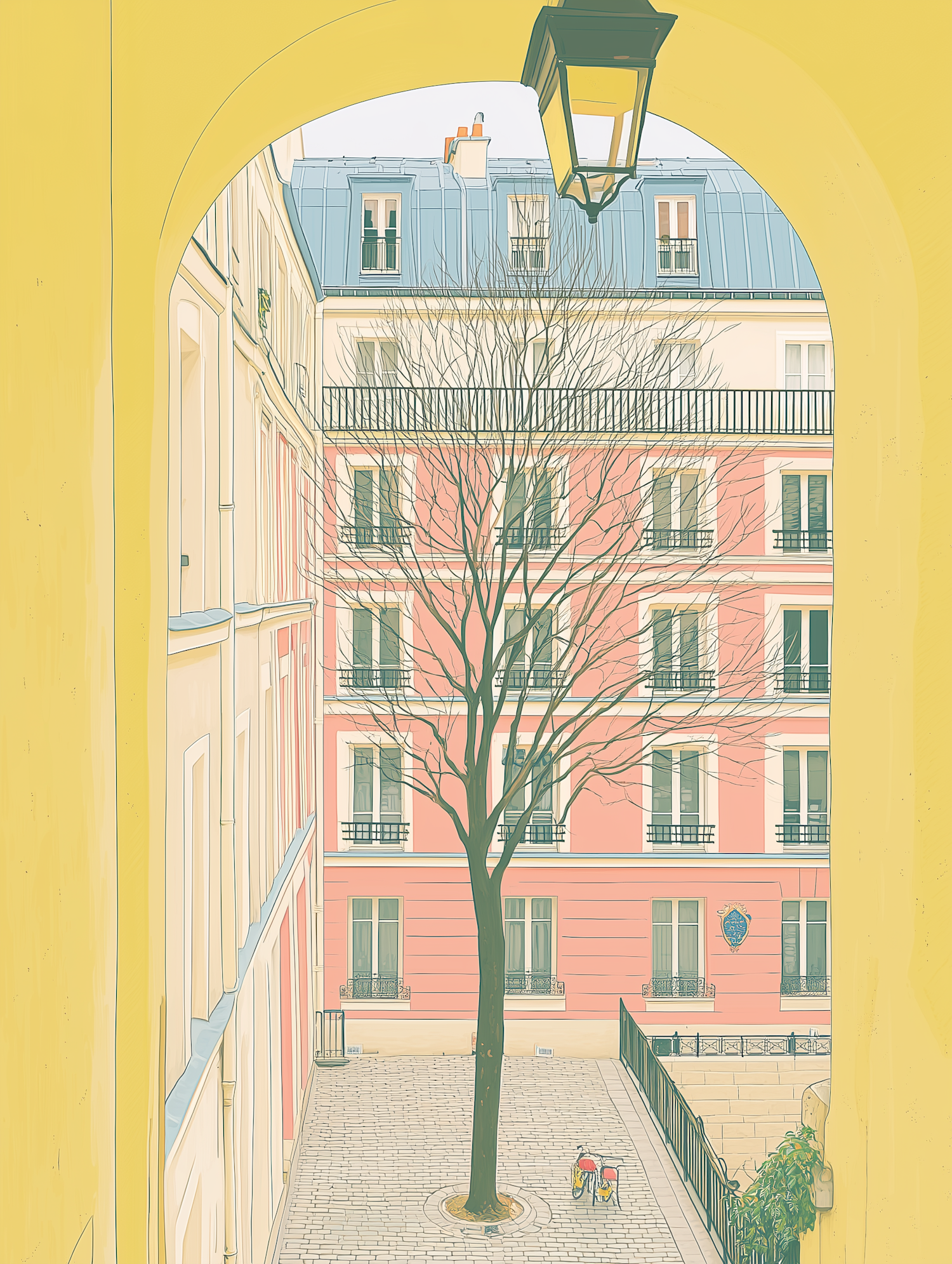 A pastel courtyard with a bare tree, pink building, and two bicycles under a yellow archway. A vintage street lamp adds charm.