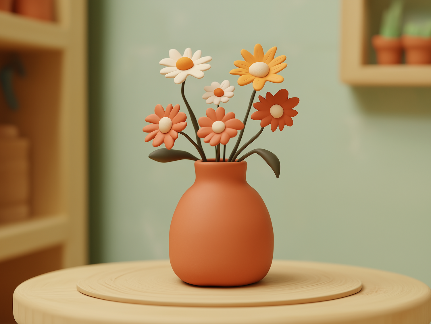 Stylized flowers in a terracotta vase on a wooden table, set against a muted green background. Minimalistic and soothing illustration.
