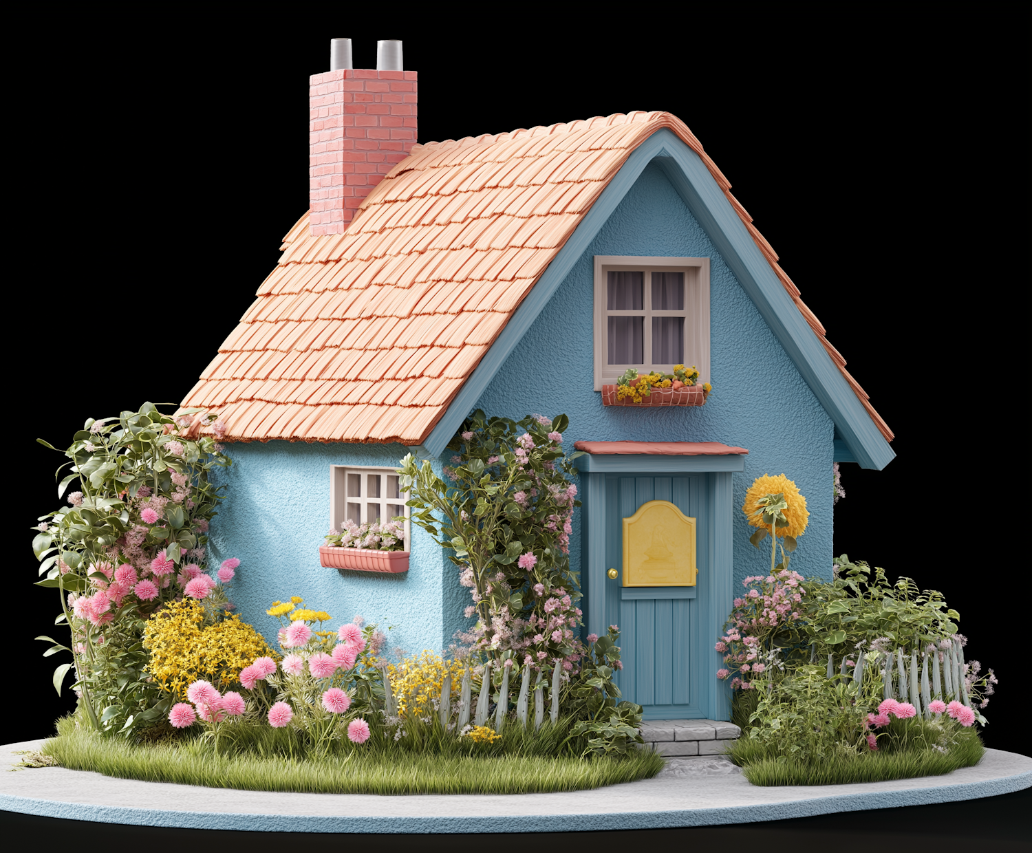 Charming blue house with orange-tiled roof, surrounded by colorful flowers and greenery, set against a black background.