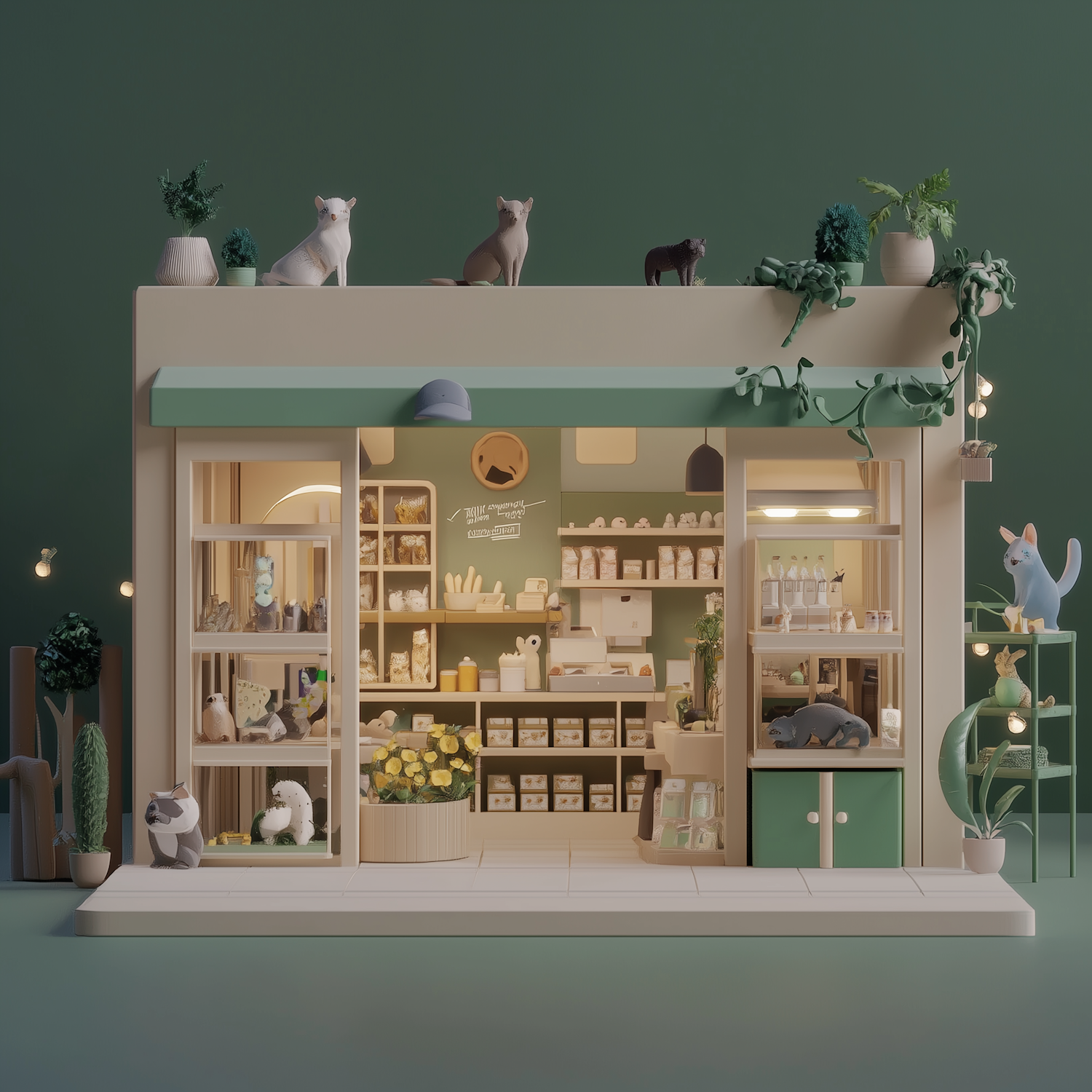 Charming pet shop illustration with green and beige tones, featuring animal figurines, plants, and cozy interior details.