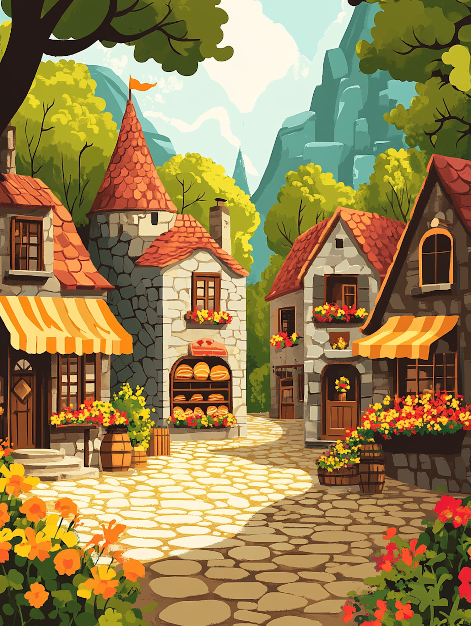 Charming village scene with stone houses, colorful flowers, and a bakery. Lush greenery and mountains in the background.