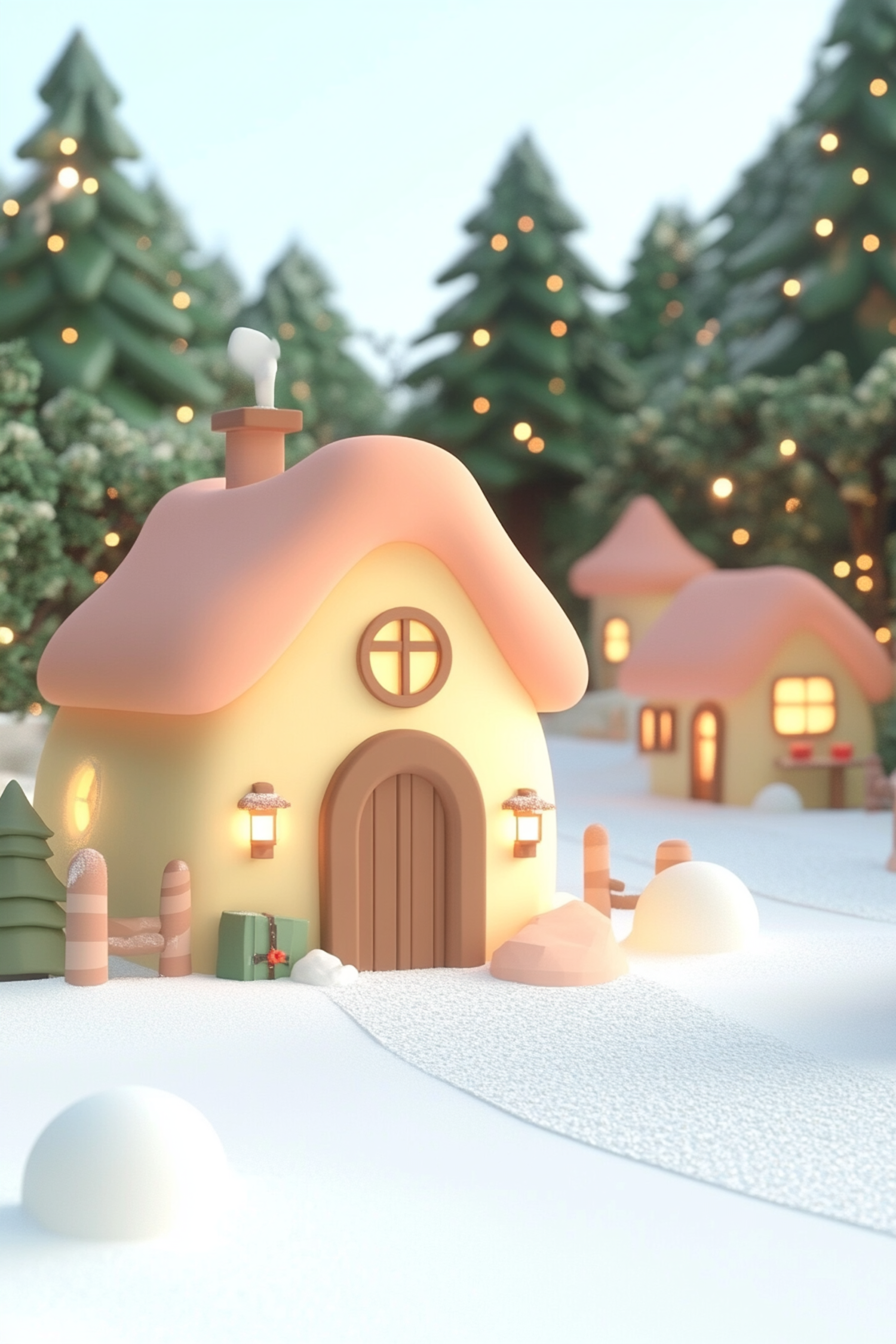 Charming winter scene with a cozy cartoon house, snow-covered landscape, and glowing lights on evergreen trees.