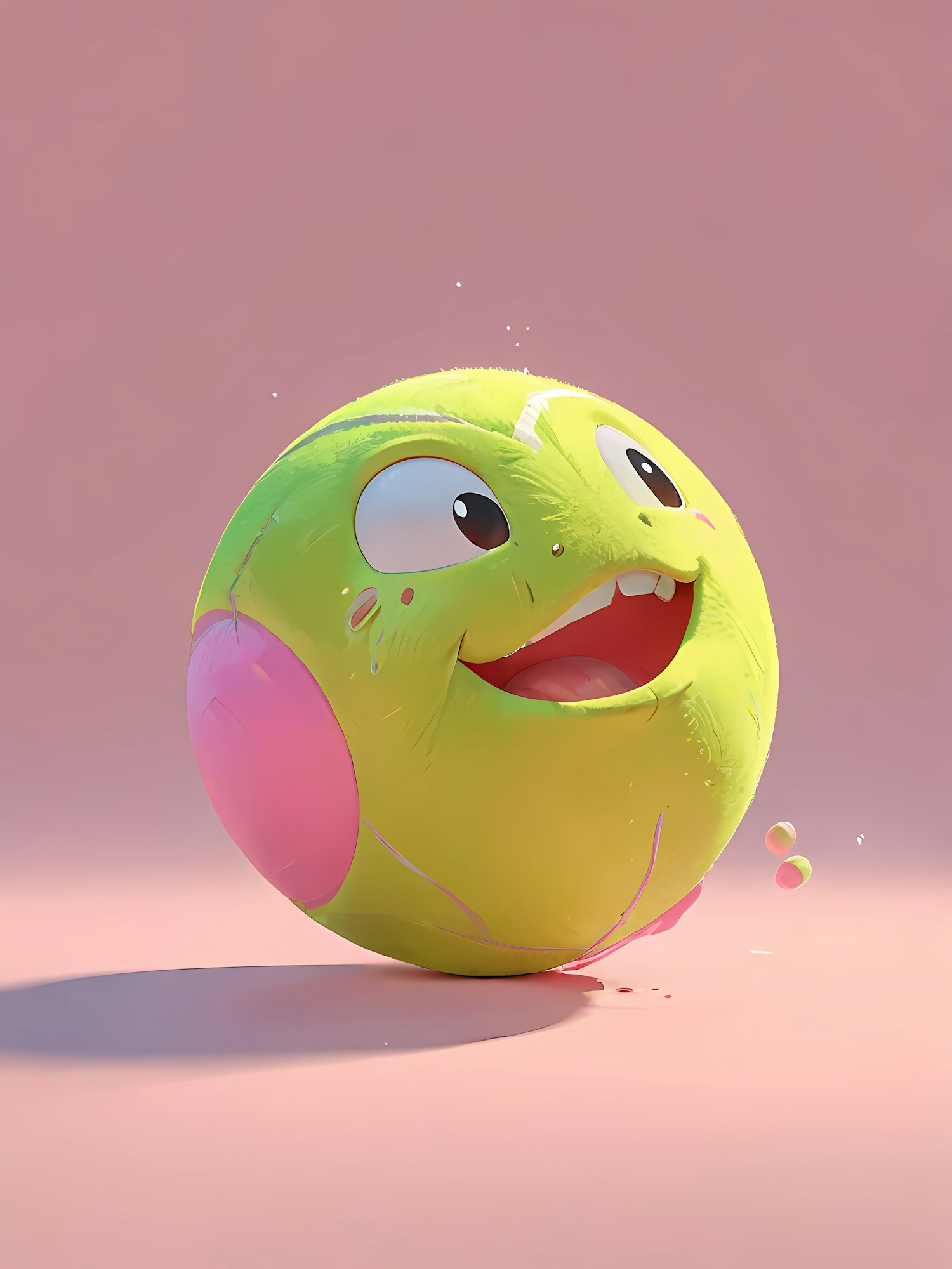 Cheerful 3D illustration of a smiling, yellow-green ball with pink accents on a soft pink background. Perfect for playful and fun vibes.