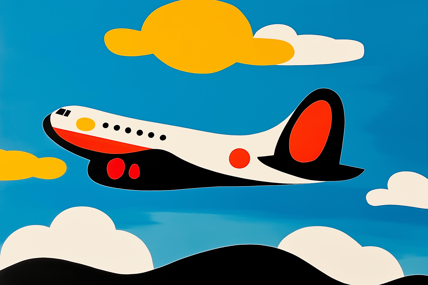 Colorful cartoon airplane flying in a bright blue sky with fluffy clouds, featuring bold red and black accents.