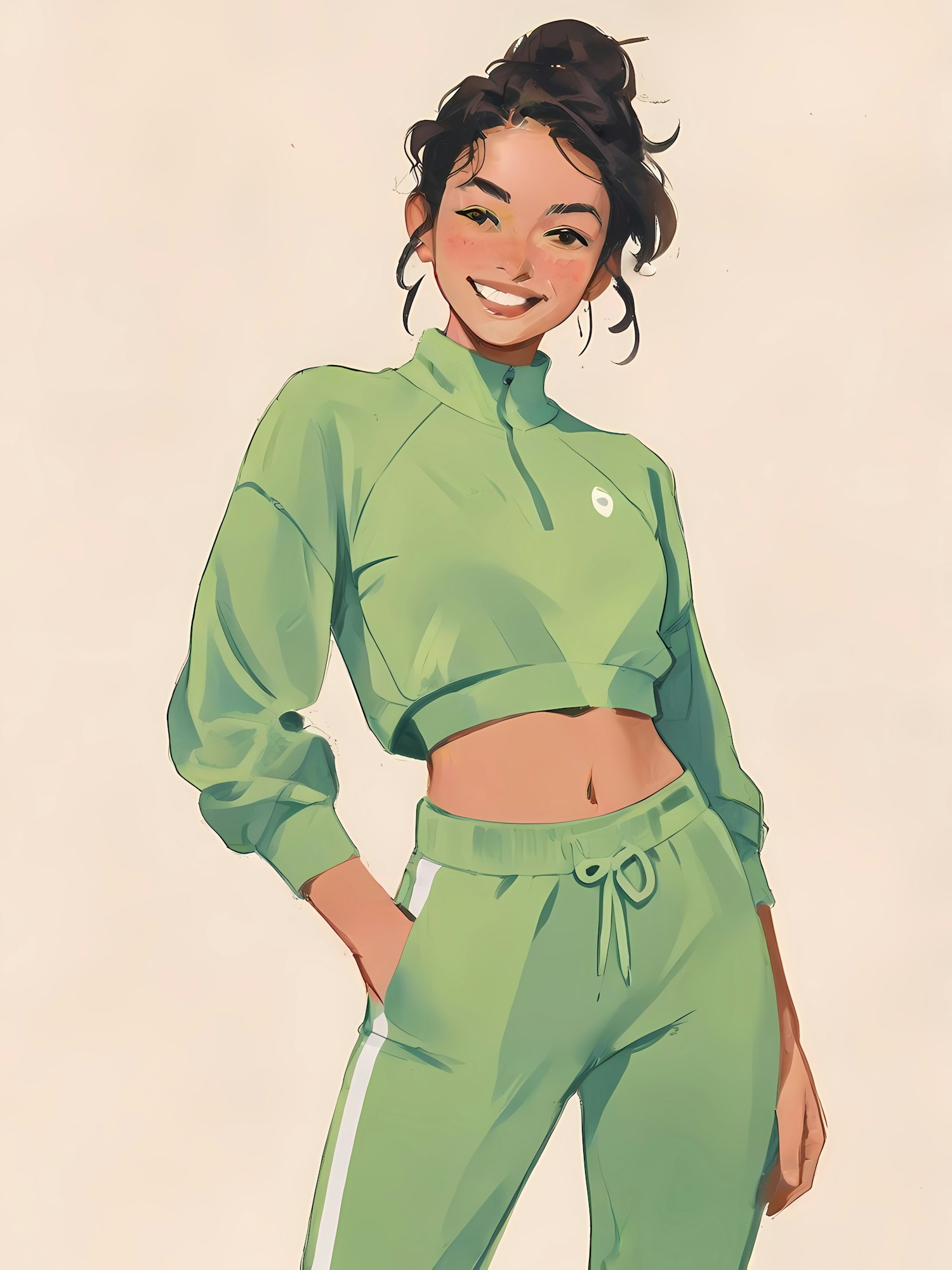 A cheerful animated character in green activewear, showcasing a vibrant and stylish look against a minimalist background.