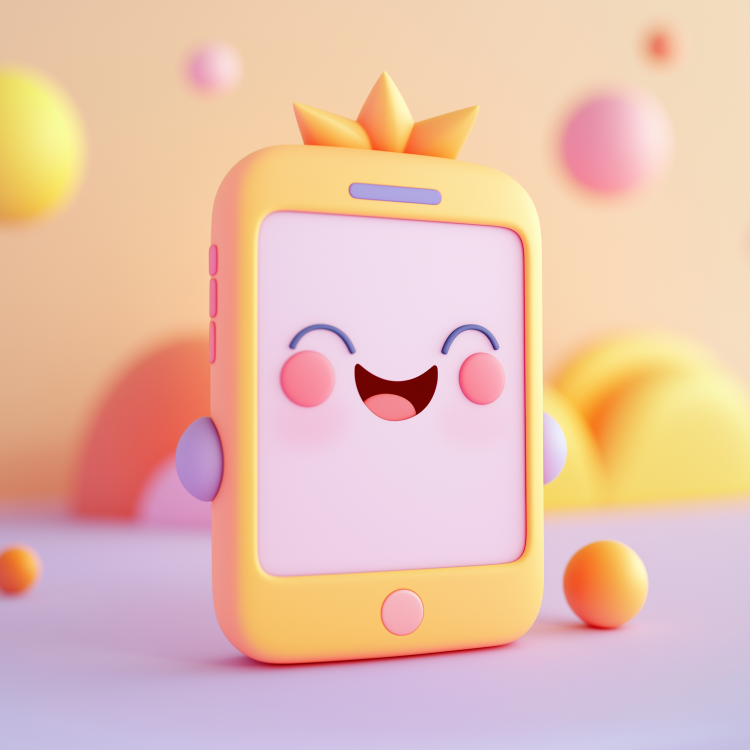 Adorable cartoon smartphone with a cheerful face and crown-like top, set against a pastel background with floating spheres.