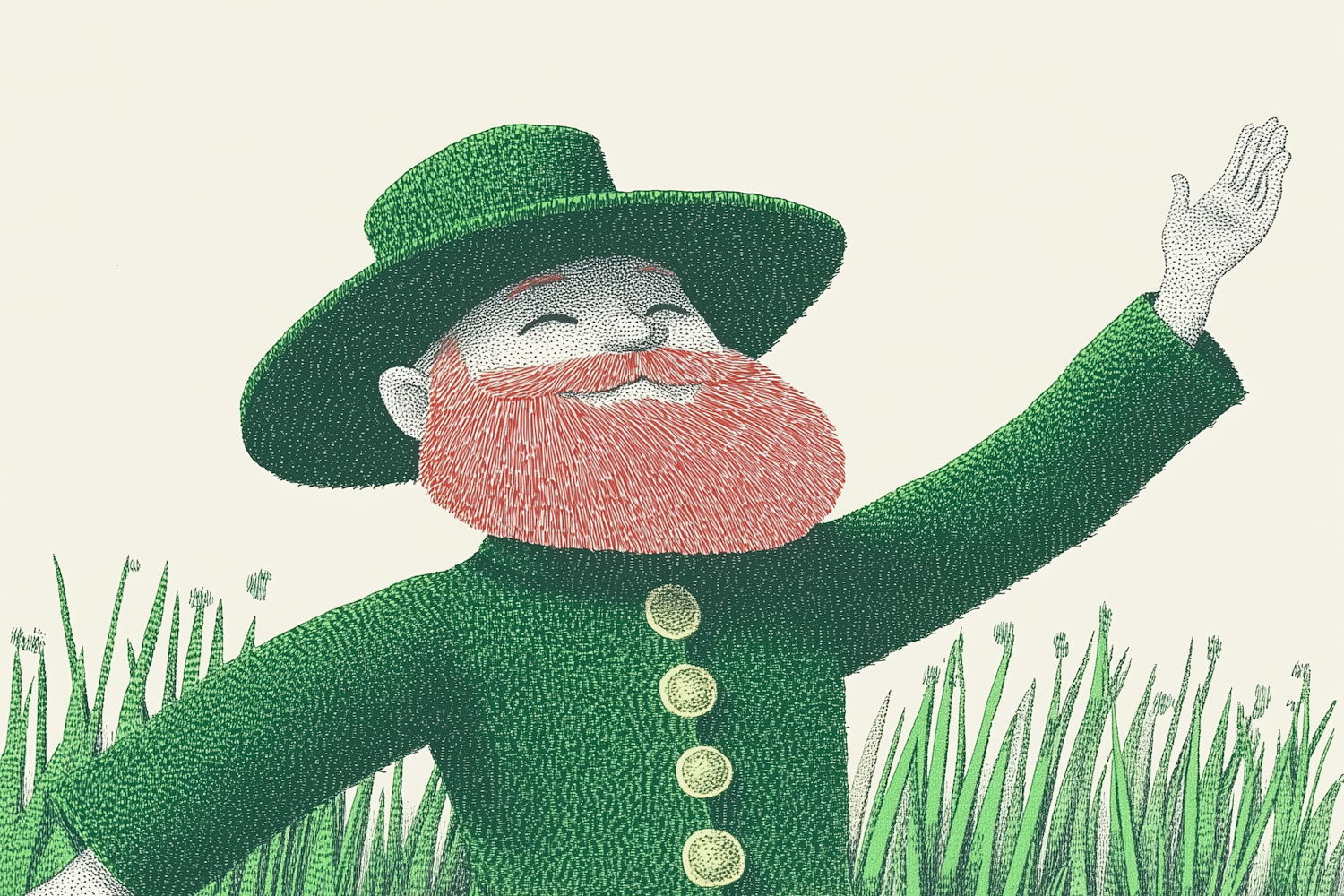 Cheerful illustration of a bearded character in green attire, standing in tall grass with a welcoming gesture and a joyful expression.