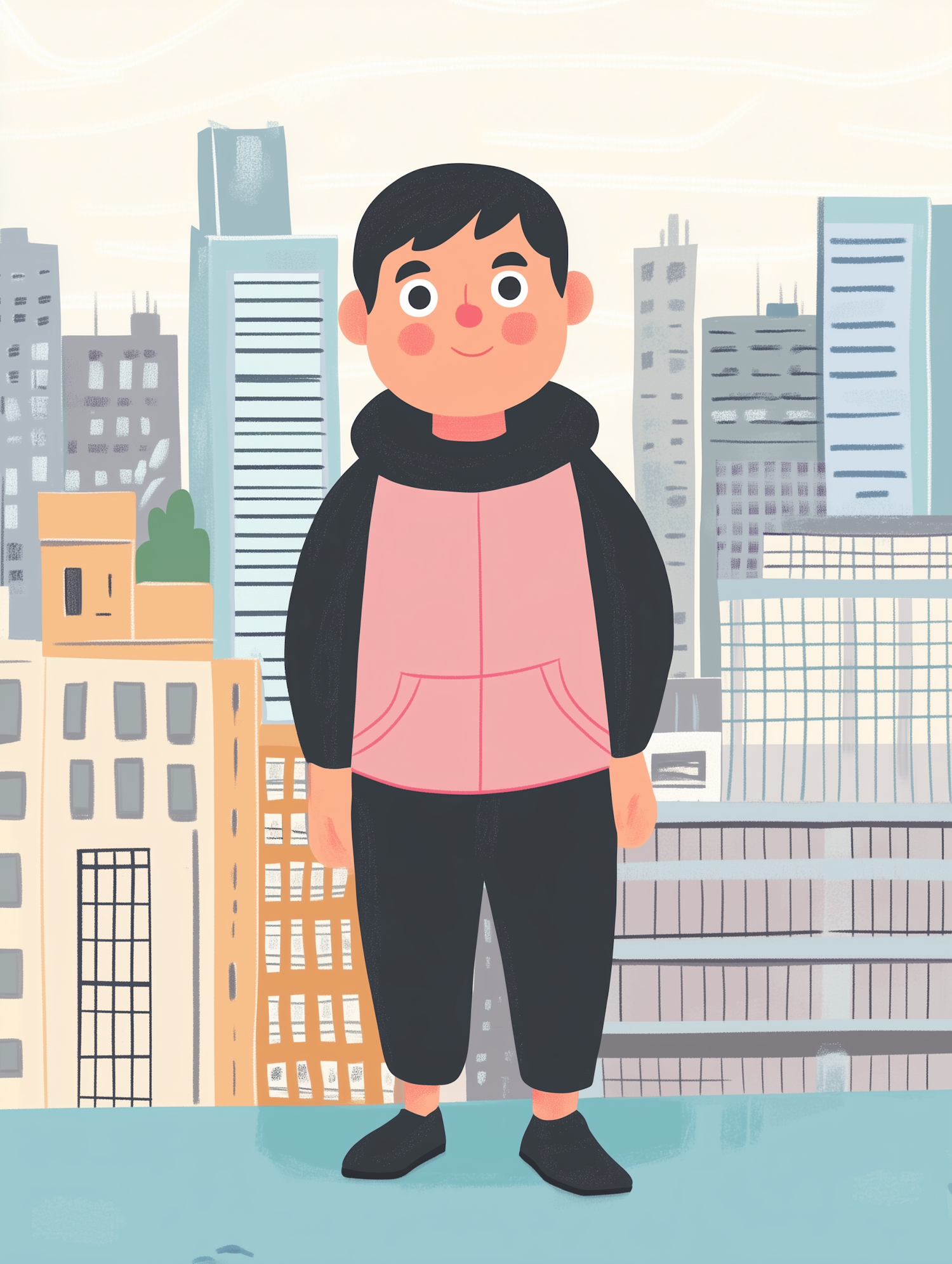Cartoon boy in pink hoodie stands before a cityscape with skyscrapers, showcasing urban life in a playful illustration.