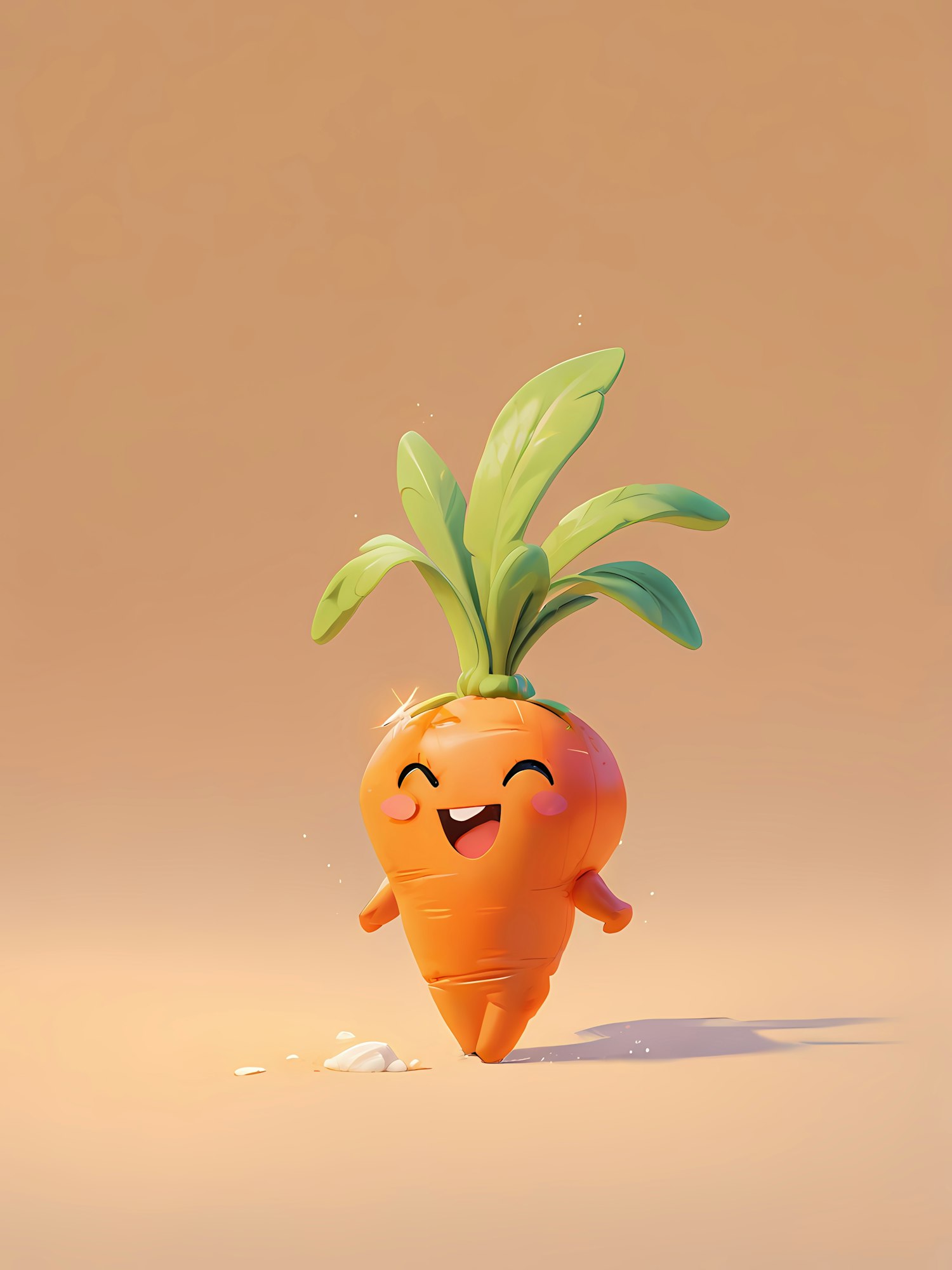 Adorable cartoon carrot with a happy face, rosy cheeks, and leafy green top, standing on a soft beige background. Perfect for playful designs.