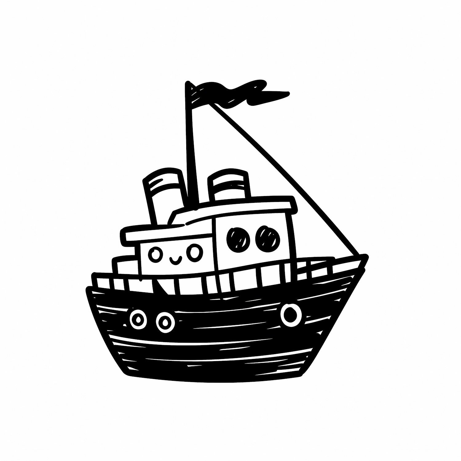 A cute black-and-white cartoon boat with a smiling face, two chimneys, and a flag, drawn in a simple and playful style.