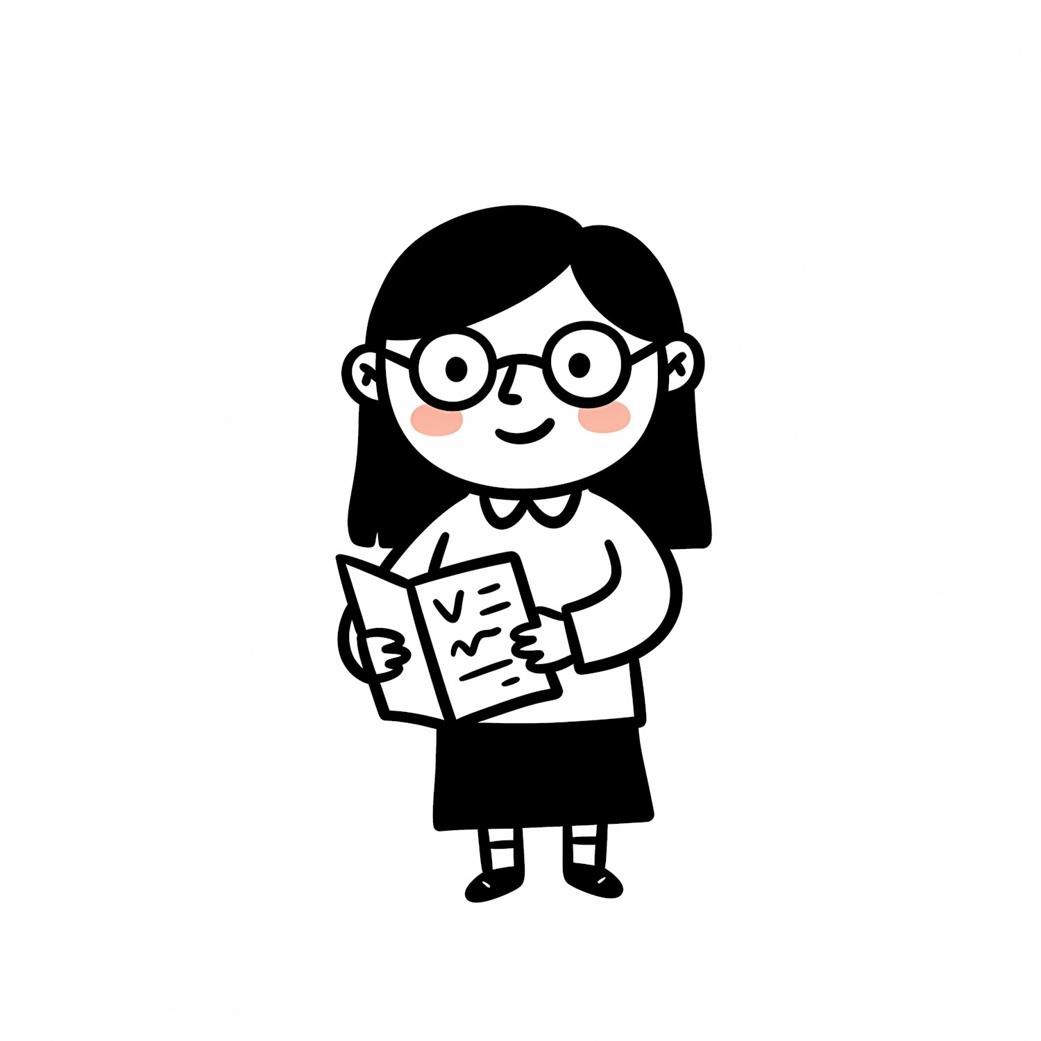 A cute cartoon character with glasses holding a book, drawn in a simple and clean style with minimal colors and a cheerful expression.