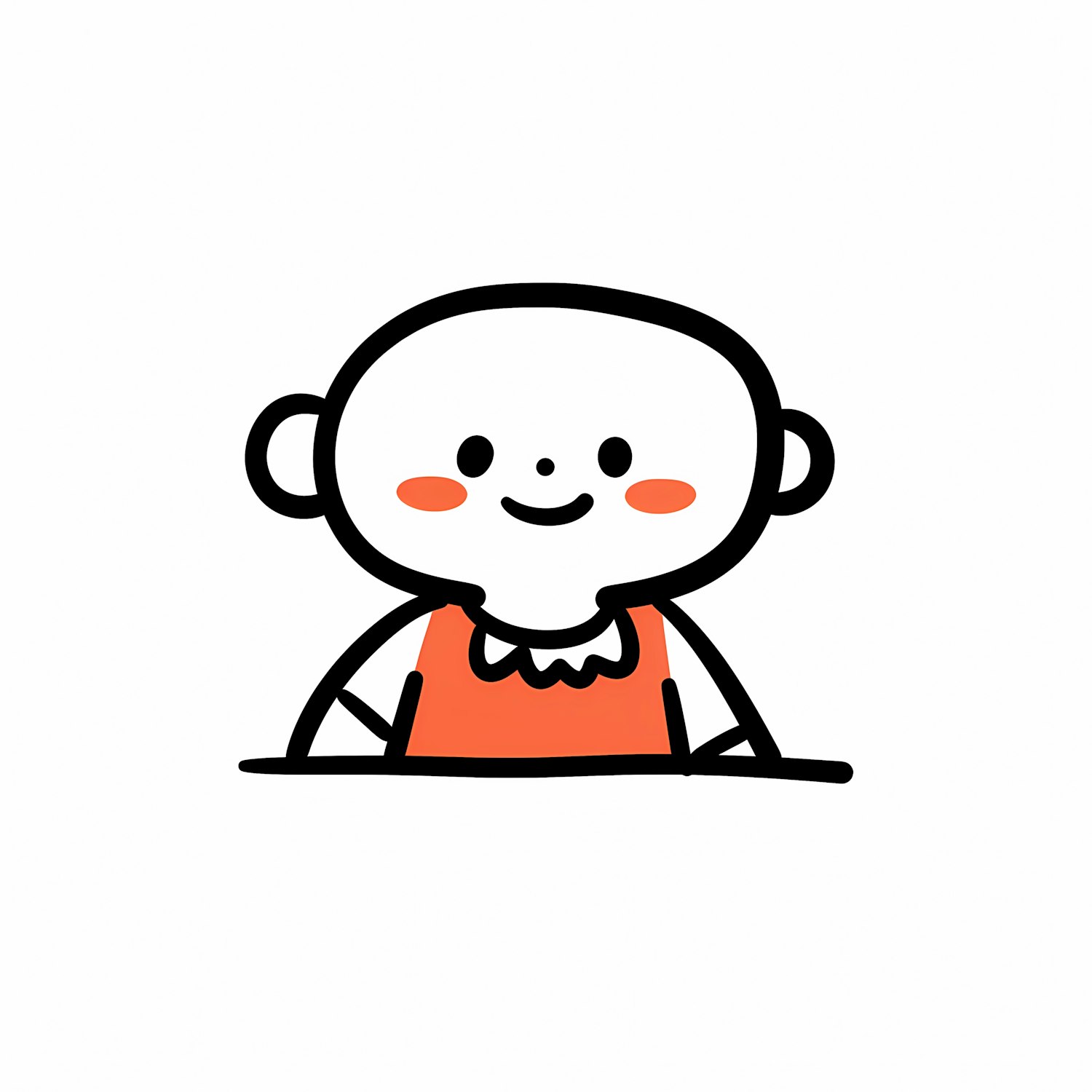 A cute cartoon character with a round head, rosy cheeks, and an orange outfit, drawn in a minimalistic style on a white background.