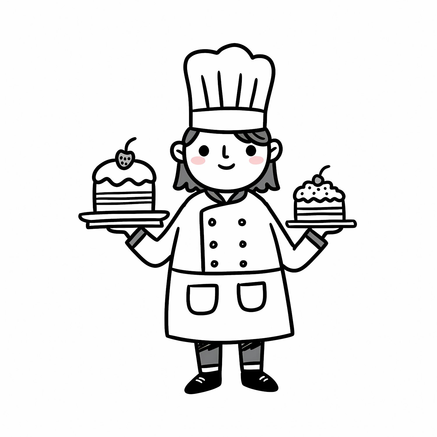 A cute cartoon chef holding two plates of desserts, wearing a chef's hat and coat, drawn in a simple black-and-white style with red accents.