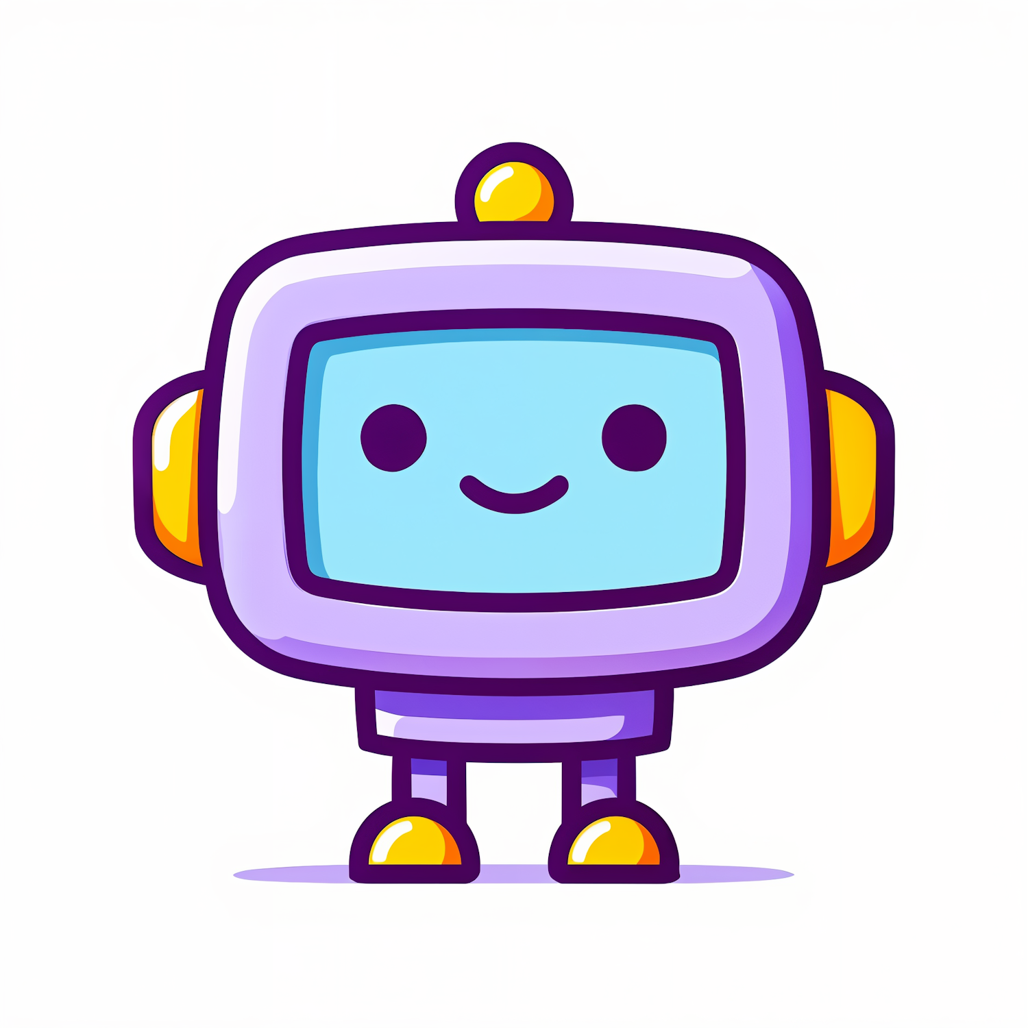 Adorable cartoon robot with a purple body, light blue face, and yellow accents, smiling cheerfully on a clean white background.
