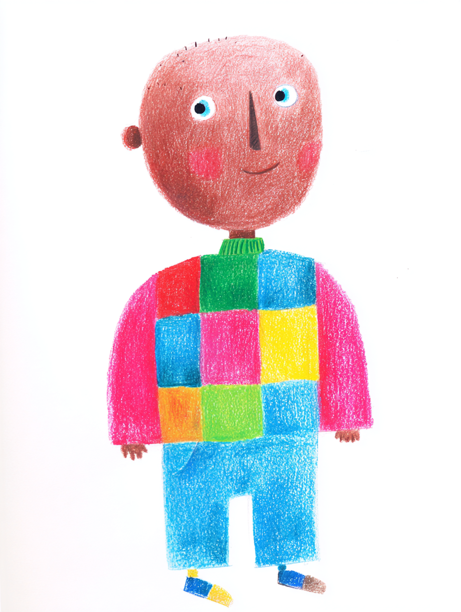 A cheerful illustration of a character in a colorful patchwork sweater and blue pants, drawn in a playful, crayon-textured style.