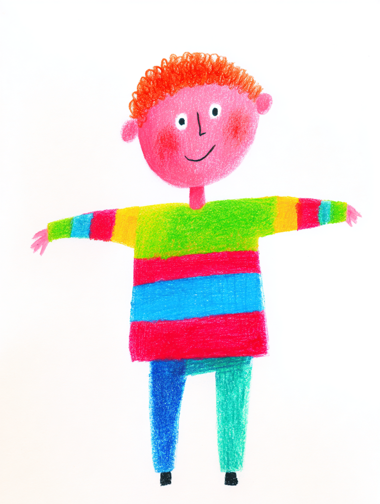 A cheerful, colorful illustration of a character in a striped sweater and mismatched pants, drawn in a playful, childlike style.