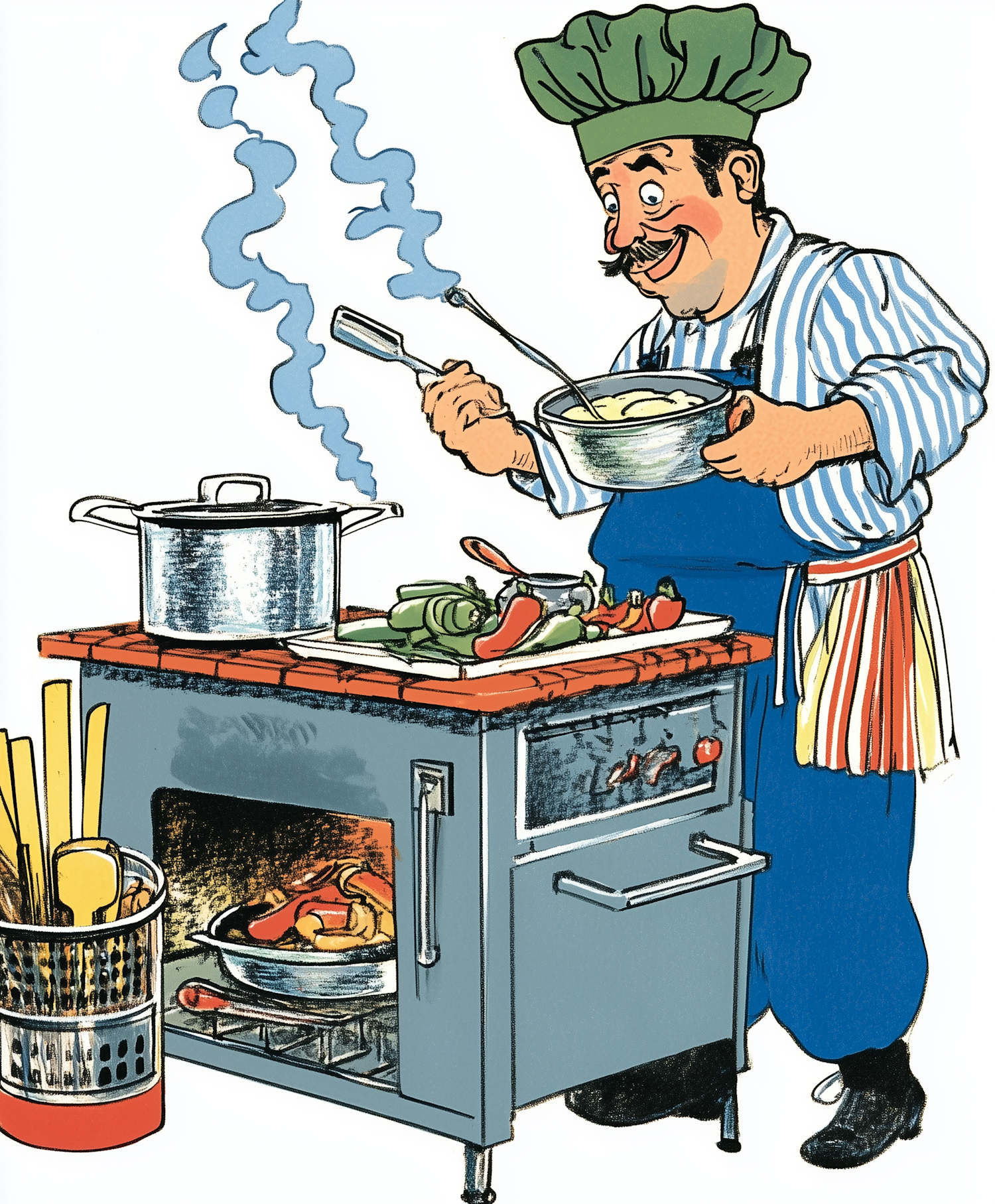 Cheerful chef cooking with a pot and ladle, surrounded by vegetables and kitchen utensils, wearing a green hat and blue apron.