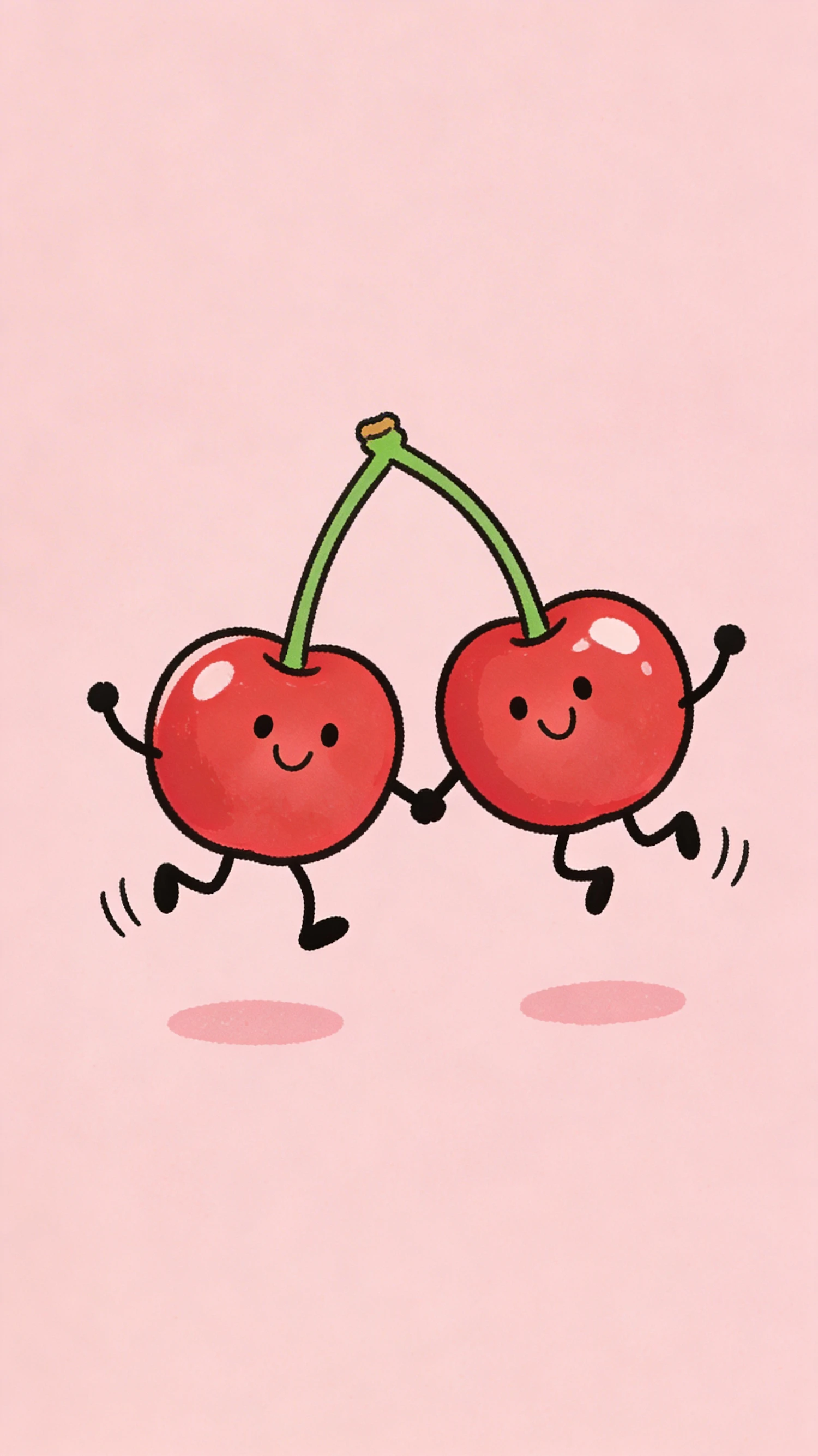 A cute illustration of two smiling cherries holding hands and skipping on a pink background, radiating joy and playfulness.