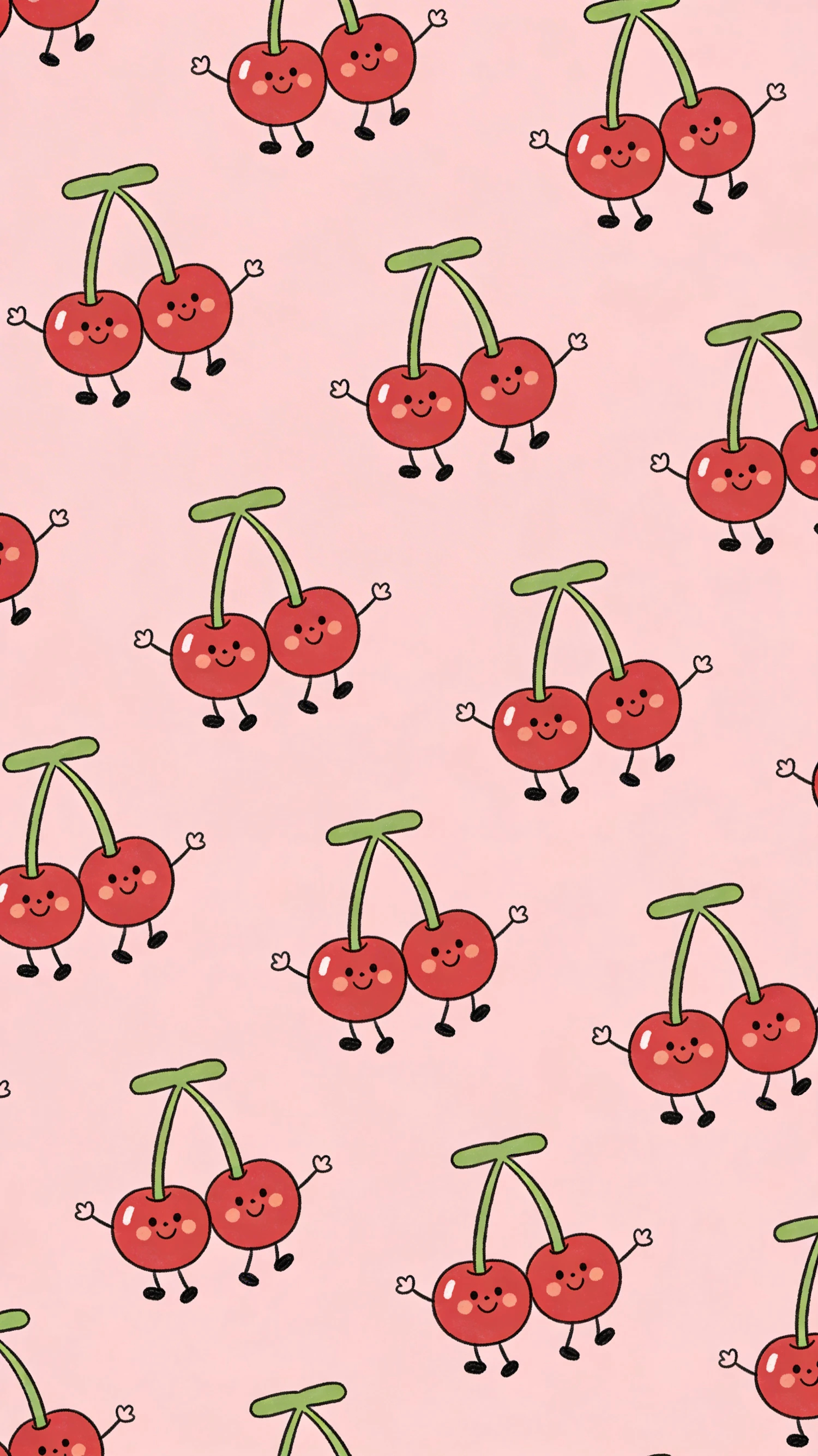 A playful pattern of cartoon cherries with smiling faces on a soft pink background, perfect for cheerful and fun designs.