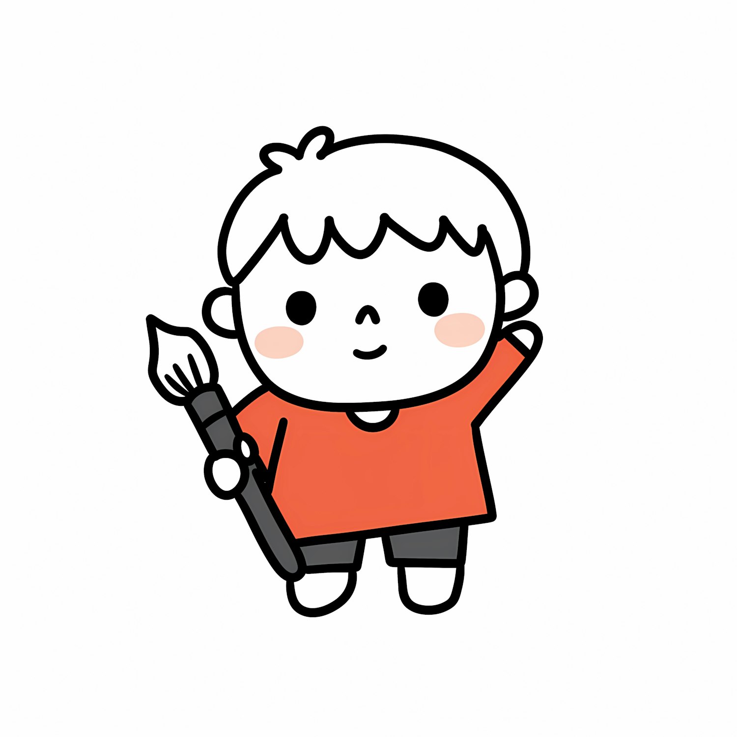 A cute cartoon child holding a paintbrush, wearing an orange shirt and dark shorts, drawn in a simple and playful style.