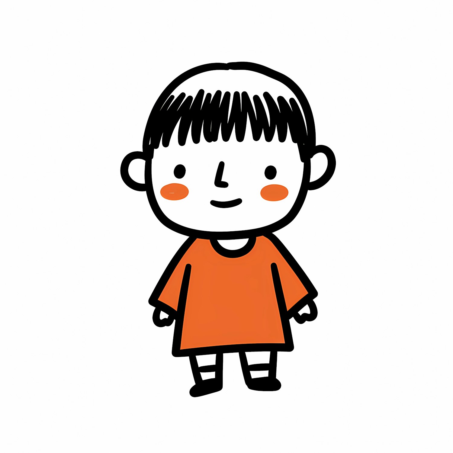 Cute cartoon child illustration with black hair, orange tunic, and a cheerful expression, drawn in a minimalistic style.