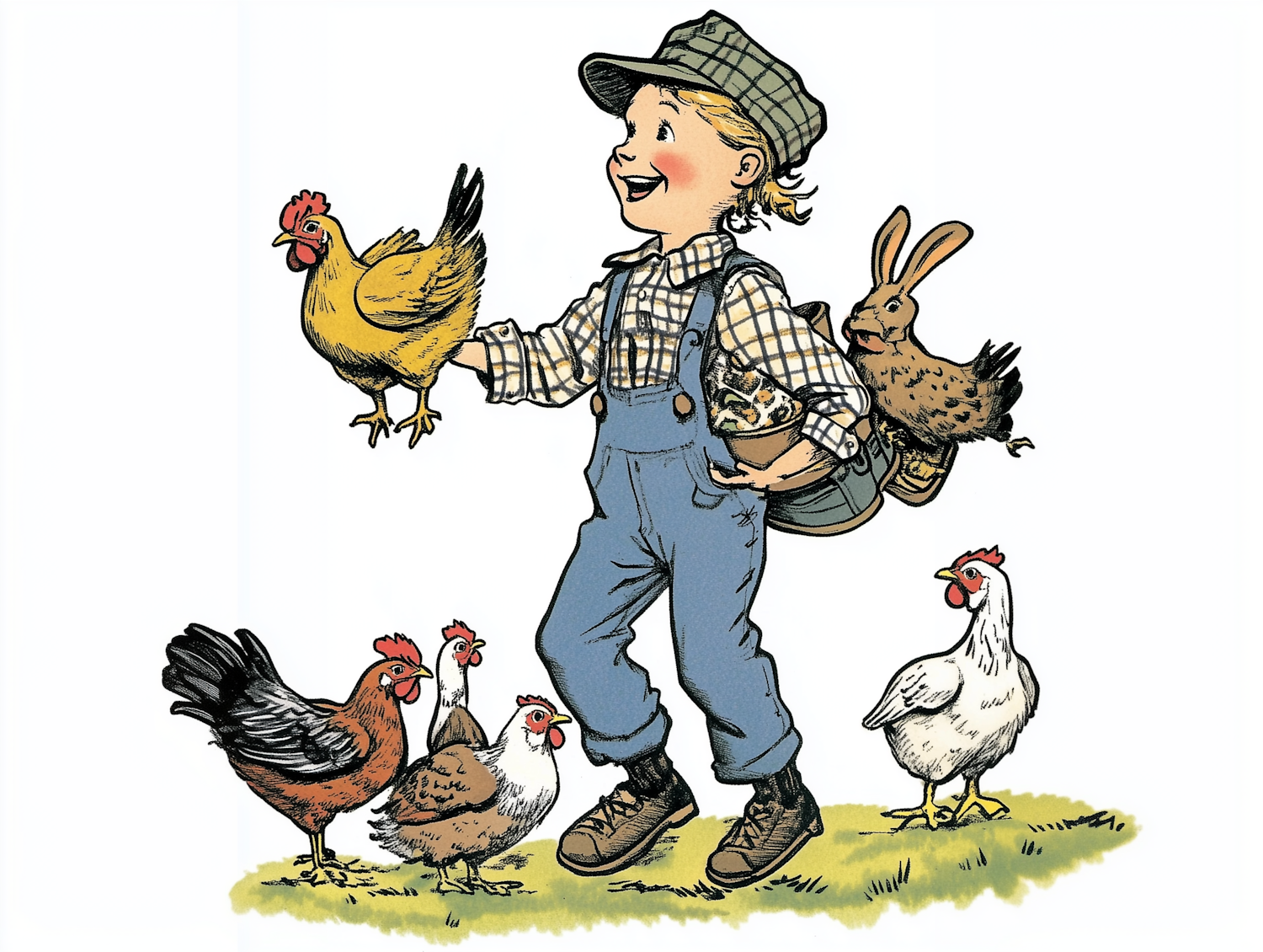 A cheerful child in overalls holds a chicken, surrounded by farm animals, in a playful and colorful illustration.