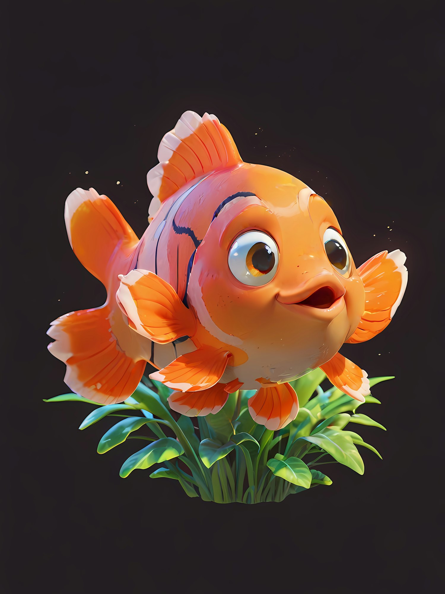 A cheerful 3D clownfish with bright orange stripes and lush green plants on a black background. Perfect for underwater-themed designs.