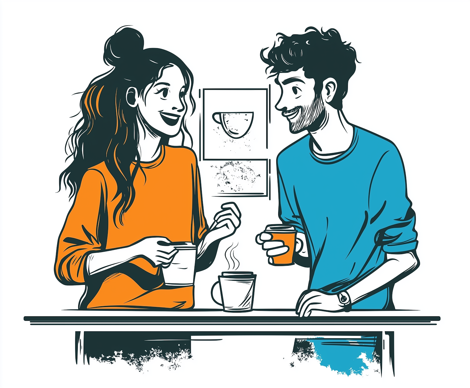 Illustration of a cheerful conversation over coffee between a woman in orange and a man in blue, set in a cozy atmosphere.