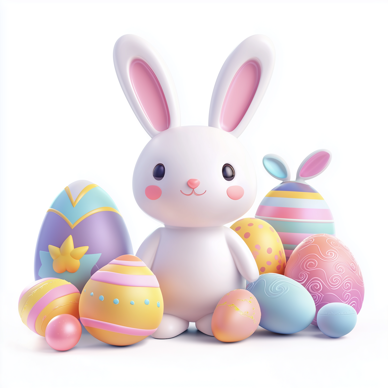 Adorable cartoon bunny with pastel Easter eggs in a playful, festive design. Perfect for celebrating the joy of Easter!
