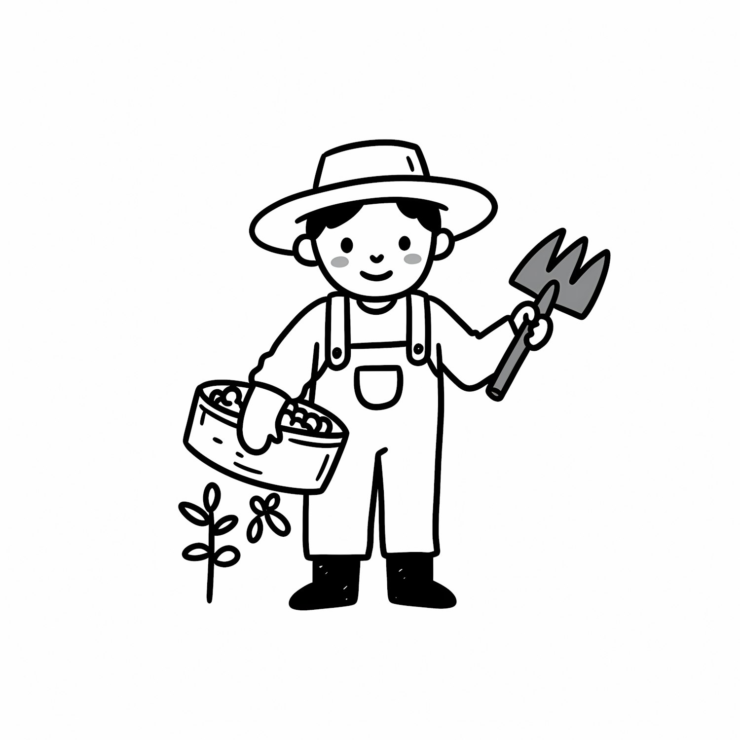 A cute black-and-white illustration of a farmer holding a basket and a gardening tool, perfect for agricultural or gardening themes.