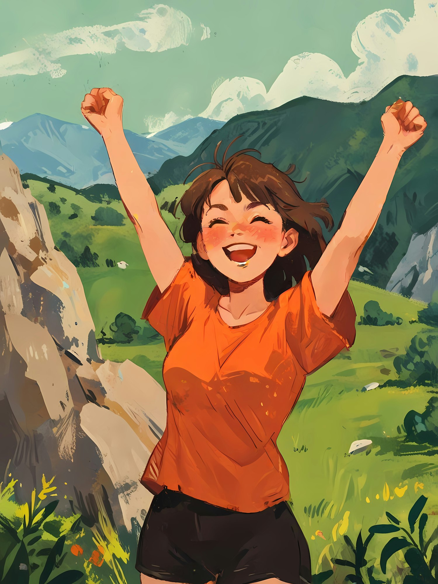 A joyful young girl outdoors on a sunny day, celebrating amidst rolling green hills and a clear blue sky.