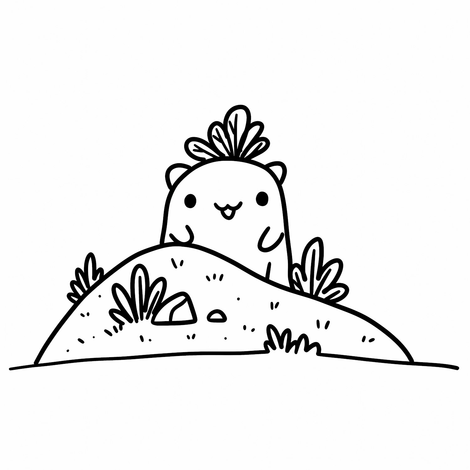 Adorable cartoon animal peeking from behind a hill with simple plants, drawn in black and white line art style.