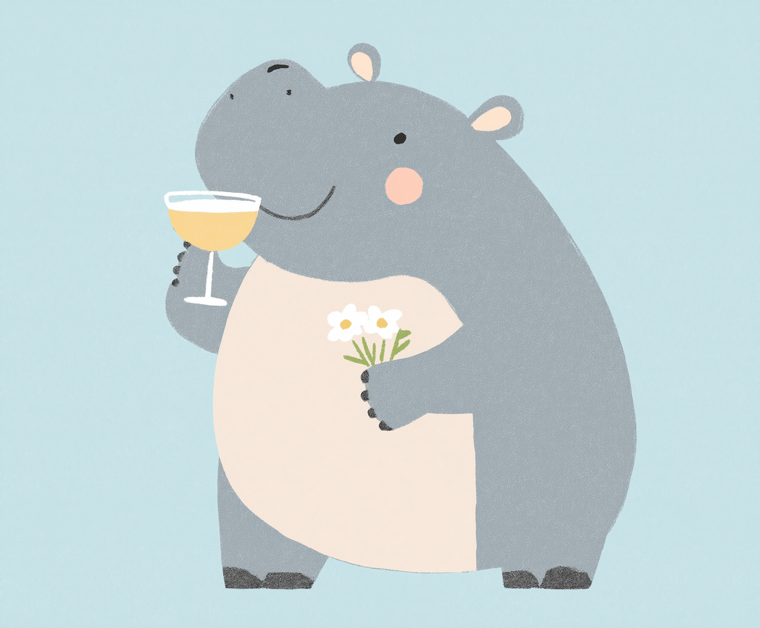Adorable cartoon hippo holding a wine glass and flowers, set against a light blue background. Whimsical and cheerful illustration.