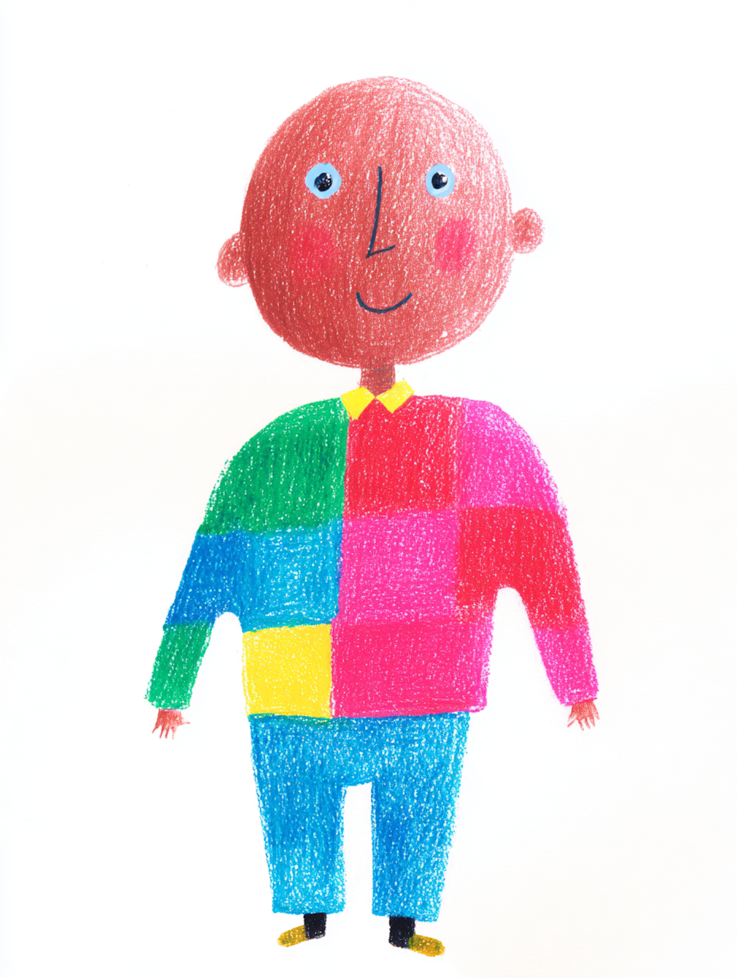 A cheerful illustration of a person in a colorful patchwork outfit, drawn in a playful, crayon-like style on a white background.
