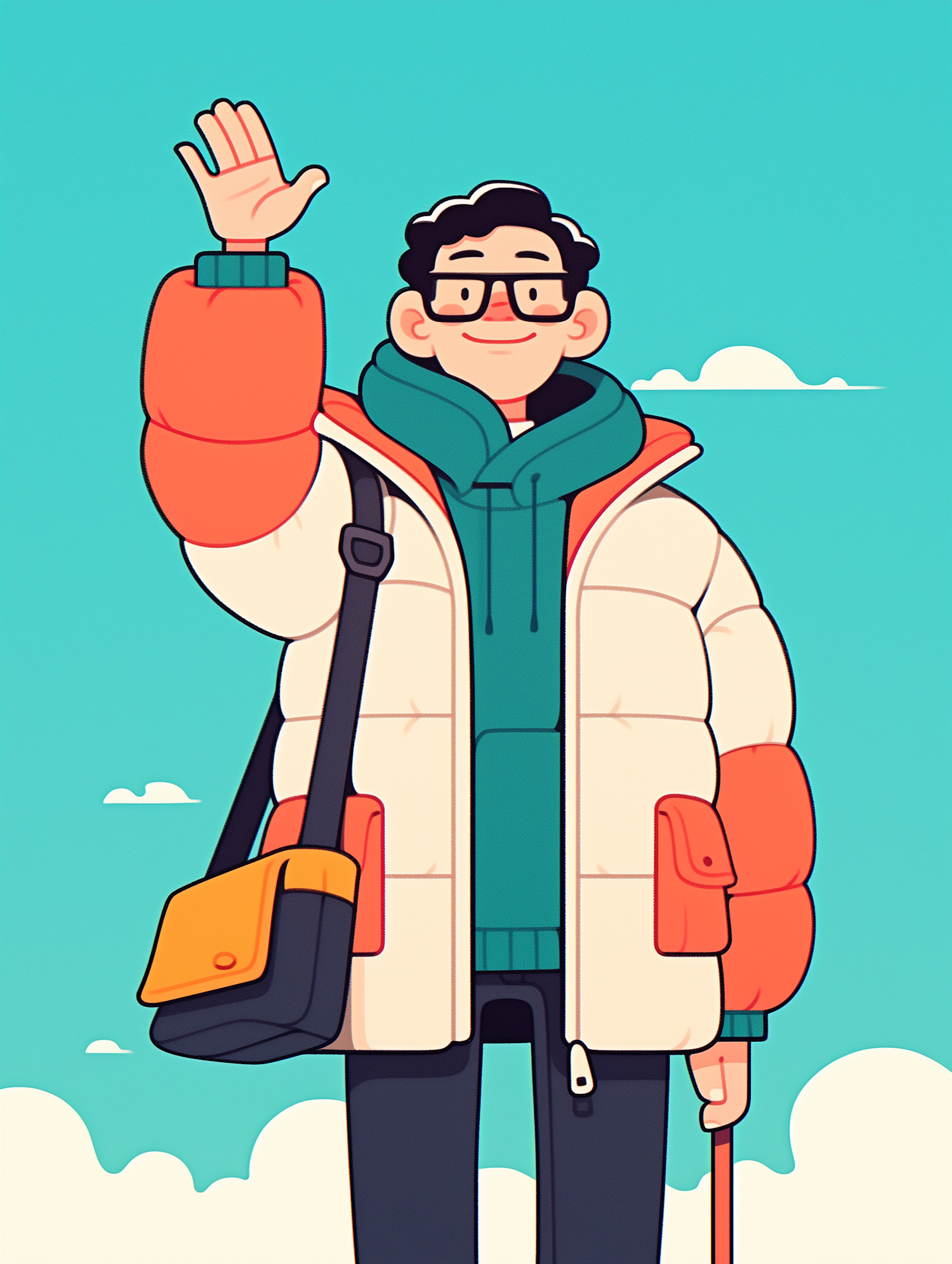 Cartoon illustration of a smiling person in a puffy jacket waving, with a bright blue sky and clouds in the background.