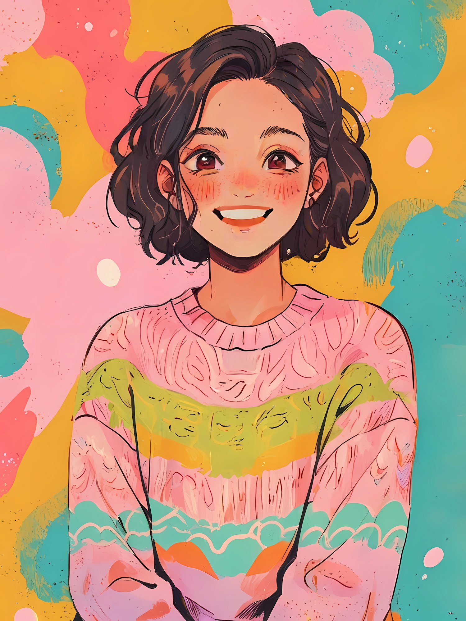 Cheerful illustration of a young woman with wavy hair and a colorful sweater against a vibrant abstract background.
